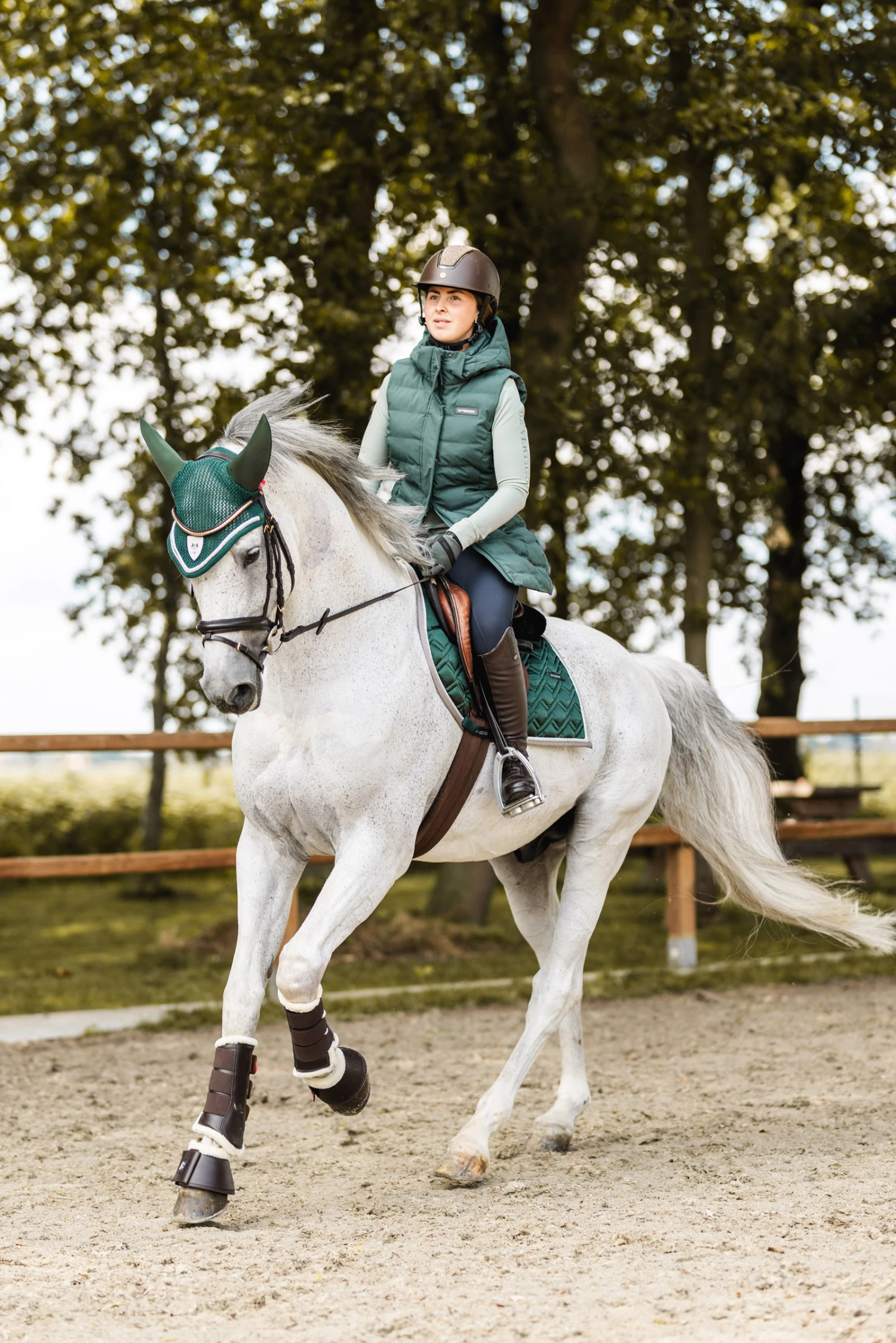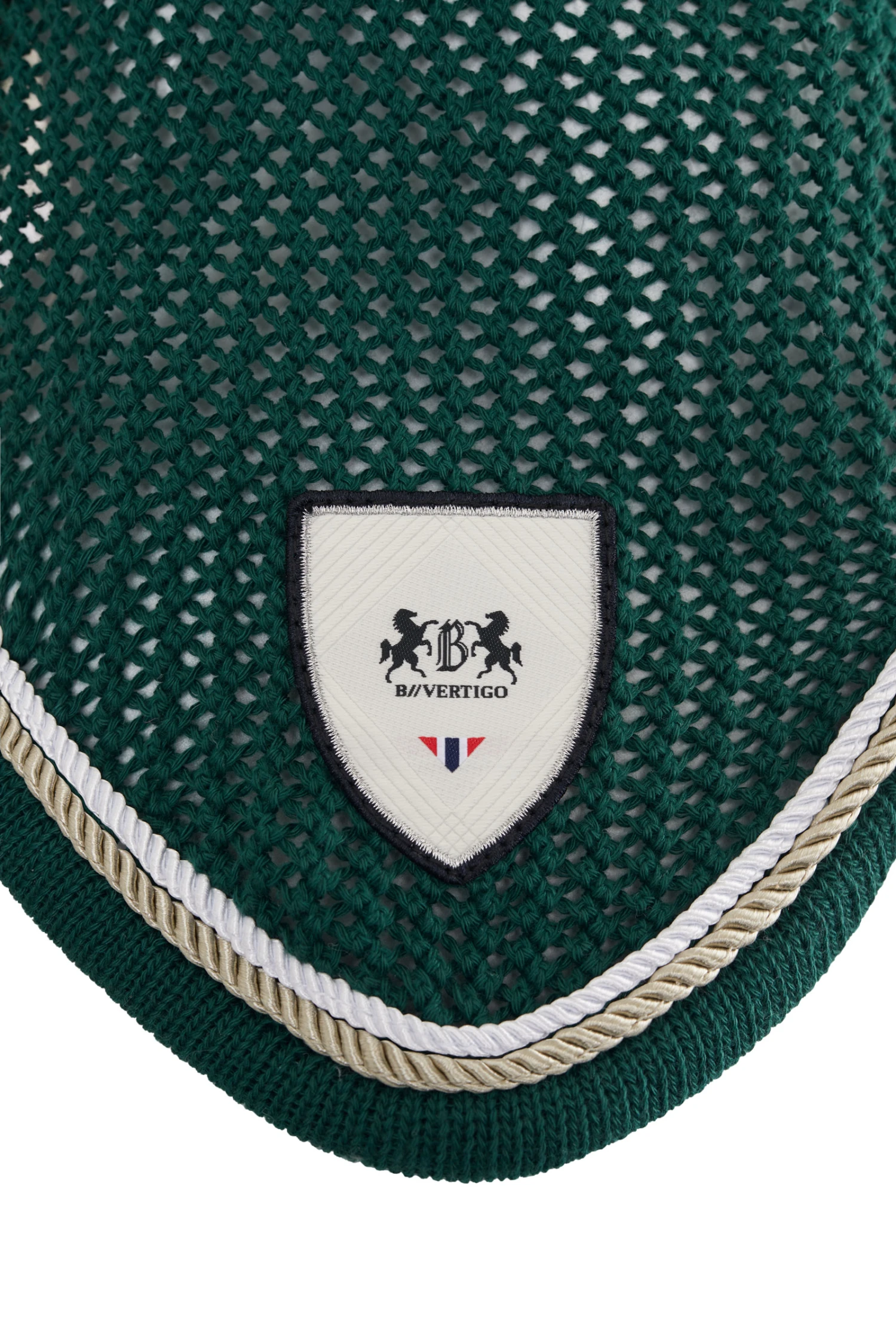 Klassisches gehäkeltes Fliegenhäubchen mit dehnbaren, schallisolierten Ohren aus Coolmax-Gewebe, das dein Pferd auch an warmen Tagen kühl hält. B Vertigo Logoaufdruck in der Mitte.