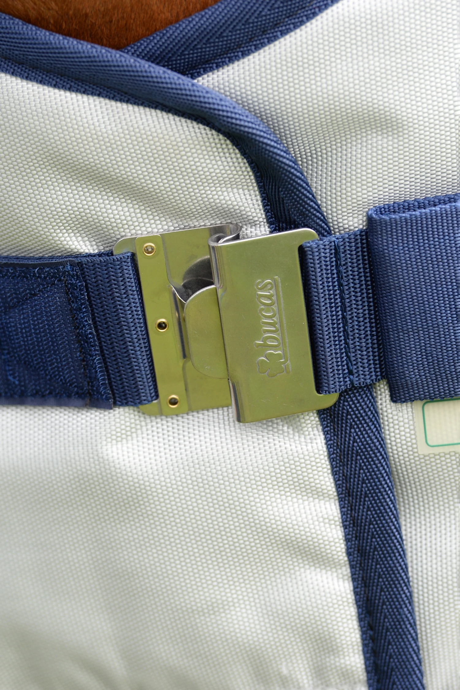 Die Power Turnout Big Neck eignet sich für Pferde mit breitem Bug, wie Friesen, Andalusier oder Hengste generell. Die Bucas Power Turnout Kollektion bietet höchste Qualität und Widerstandsfähigkeit, dank des ballistischen Nylon. Diese Webtechnik macht das Außenmaterial besonders robust und reißfähig. Zusätzlich ist die Decke somit wasserdicht, atmungsaktiv. Dank des speziellen Stay-Dry Innenfutters kann die Power Turnout wie eine Abschwitzdecke auf auf das noch nasse Pferd gelegt werden. Das Pferd trocknet nicht nur schnell ab, sondern muss auch nicht umgedeckt werden. Außerdem besitzt das Innenfutter antimikrobielle Eigenschaften, so bleibt die Decke frisch, auch wenn sie nach dem Reiten auf das verschwitzte Pferd gelegt wird. Anders als viele andere Decken dieser Gewichtsklasse sorgt die Power Turnout für Komfort und Schutz zwischen -5 und 16 Grad Außentemperatur, dank der wärmereflektierenden Aluminium-Innenbeschichtung. An der Schulter ist die Decke innen besonders weich unterlegt um Scheuerstellen zu vermeiden. Mit dem Click ’n Go Verschluss mit magnetischem Schnappverschluss ist die Decke schnell und einfach verschließbar. Reflektorstreifen am Schweiflatz und am Bug sorgen für gut Sichtbarkeit im Dunkel. Das passende Halsteil (24066) findest du auch bei uns.