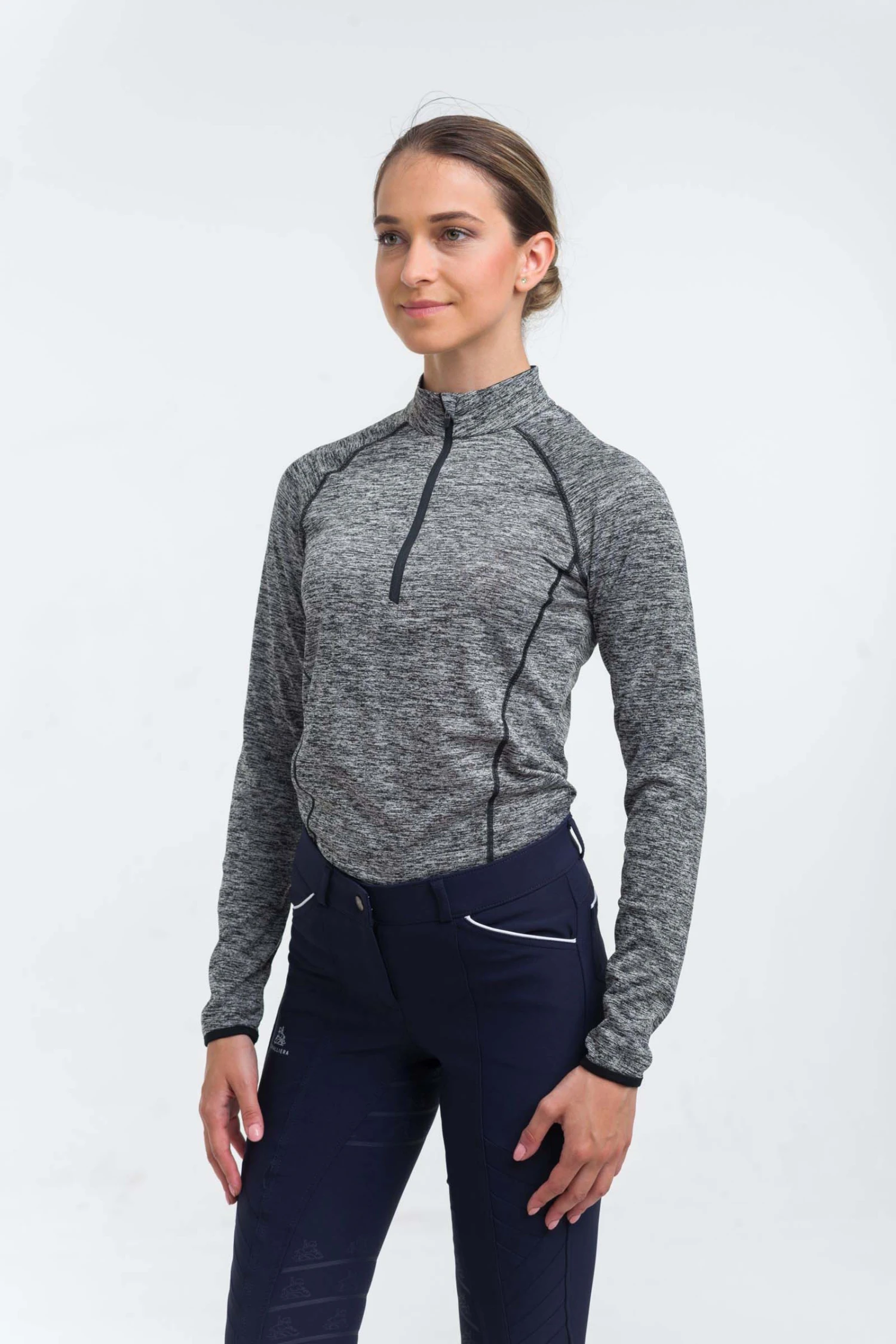 Ein Reitoberteil, das das ganze Jahr über getragen werden kann. Leicht trocknend und atmungsaktiv. Mit silbernem Pferdegebiss am Hals.