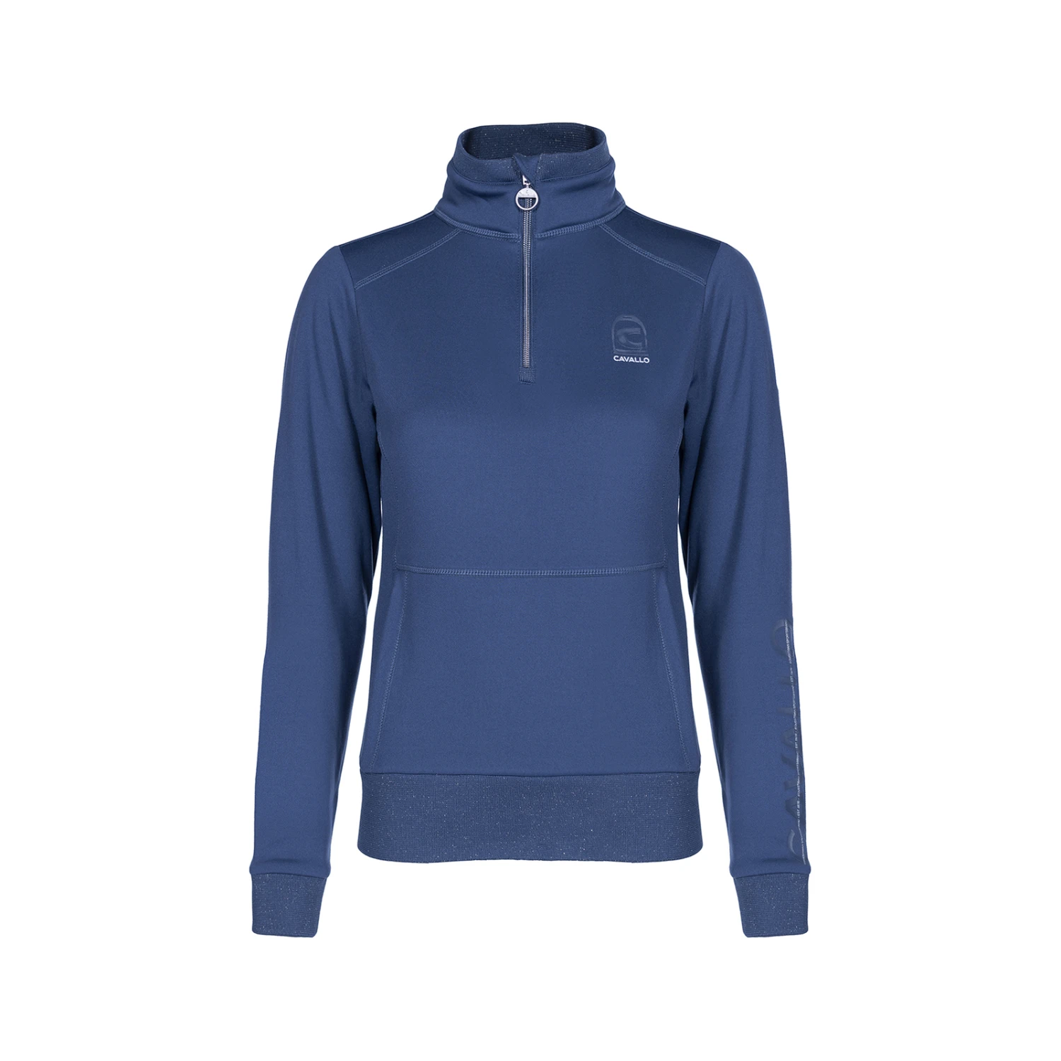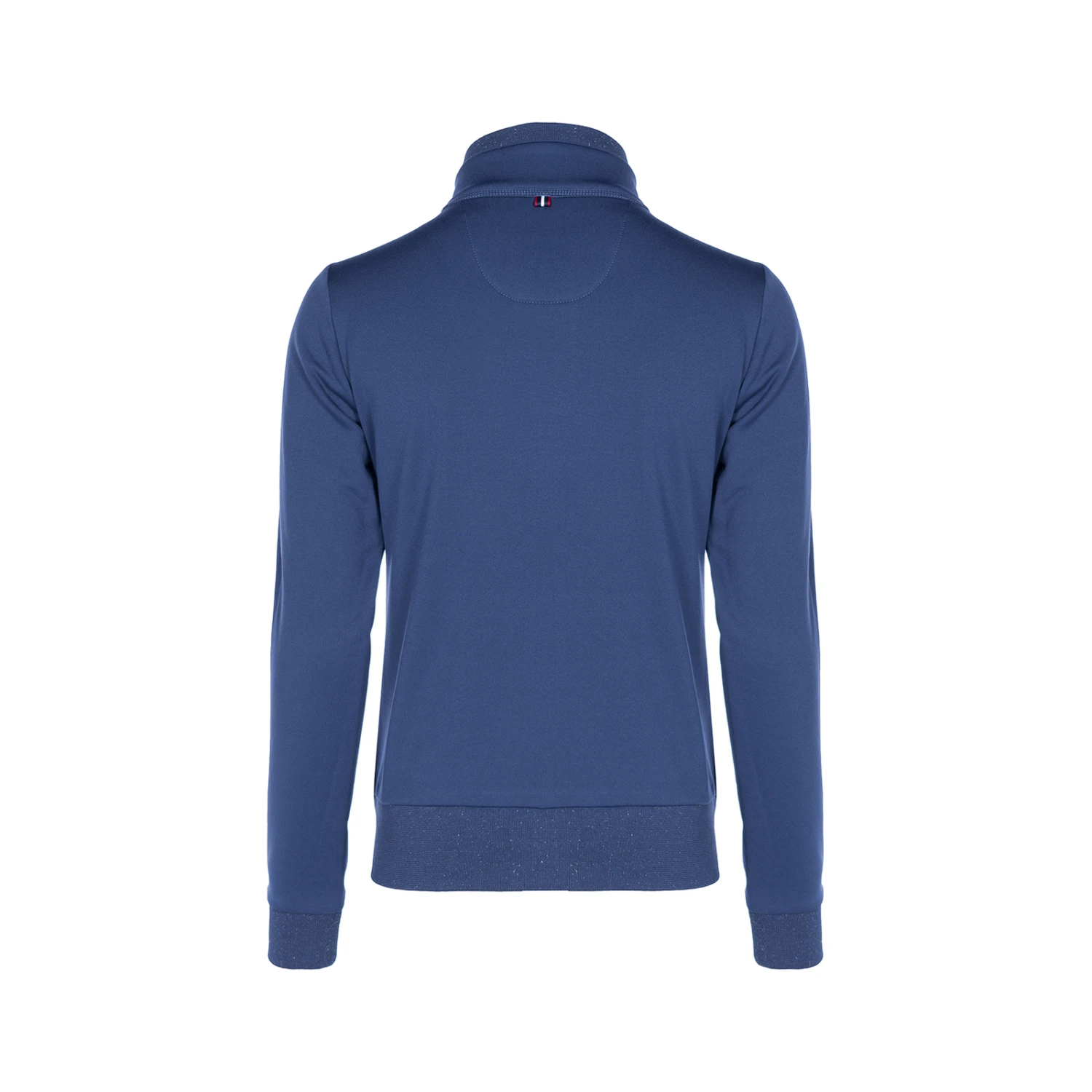 Dieses schicke und sportliche bi-elastische Longsleeve hat einen Stehkragen und ist aus Funktions-Fleece gefertigt. Durch die taillierte Taillierung erzeugt es einen femininen Look. Die glatte Außenseite verhindert, dass Fell daran hängen bleibt. Elastische Bündchen machen das Shirt angenehm zu tragen. Schimmernde Fäden verlaufen durch Kragen und Bund und lassen das Shirt elegant aussehen. Ein Cavallo-Print in Gummi-Optik ziert die linke Brust. Zwei Reißverschlusstaschen auf der Vorderseite bieten Platz für dein Handy, Pferdeleckerlis oder ähnliches. Die Schieber der Reißverschlüsse sind für etwas Bling mit je einem kleinen Kristall verziert.