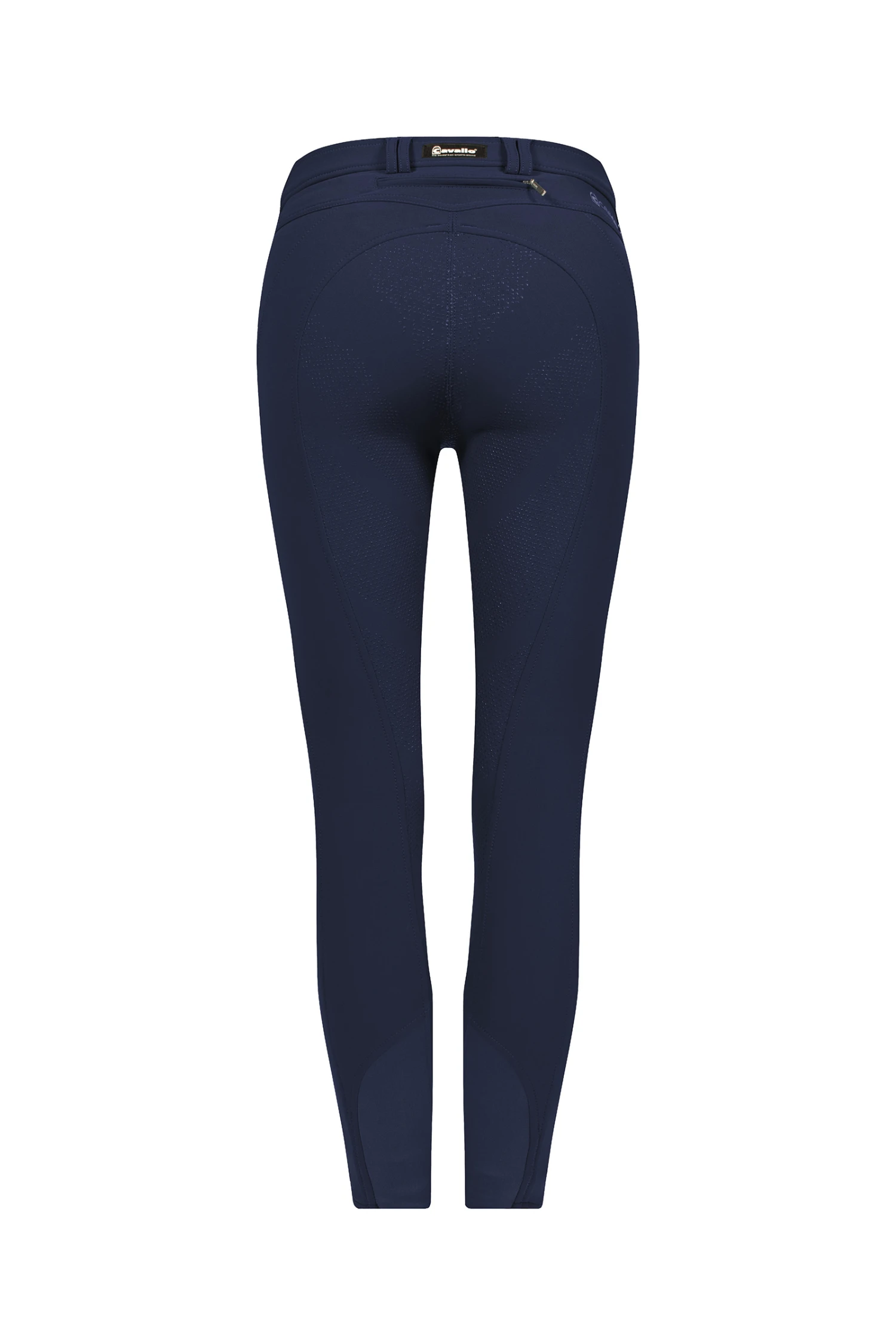 Sportliche Reithose im 5-Pocket-Look. Zwei komfortable Schubtaschen vorn, mit funkelnden Kristallnieten verziert. Volle Bequemlichkeit aufgrund fehlender Teilungsnaht am Knie. Aufgesetzte Handytasche, mit Cavallo typischem Streifenband und Steigbügel Print. Zusätzliche Reißverschlußtasche am Sattel hinten bietet sicheren Platz für die wichtigen Dinge. Die raffinierte Nahtführung auf der Hinterhose zaubert die perfekt, sportliche Figur.