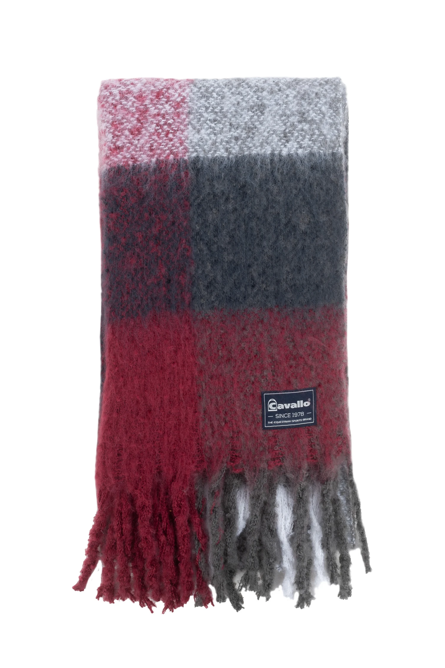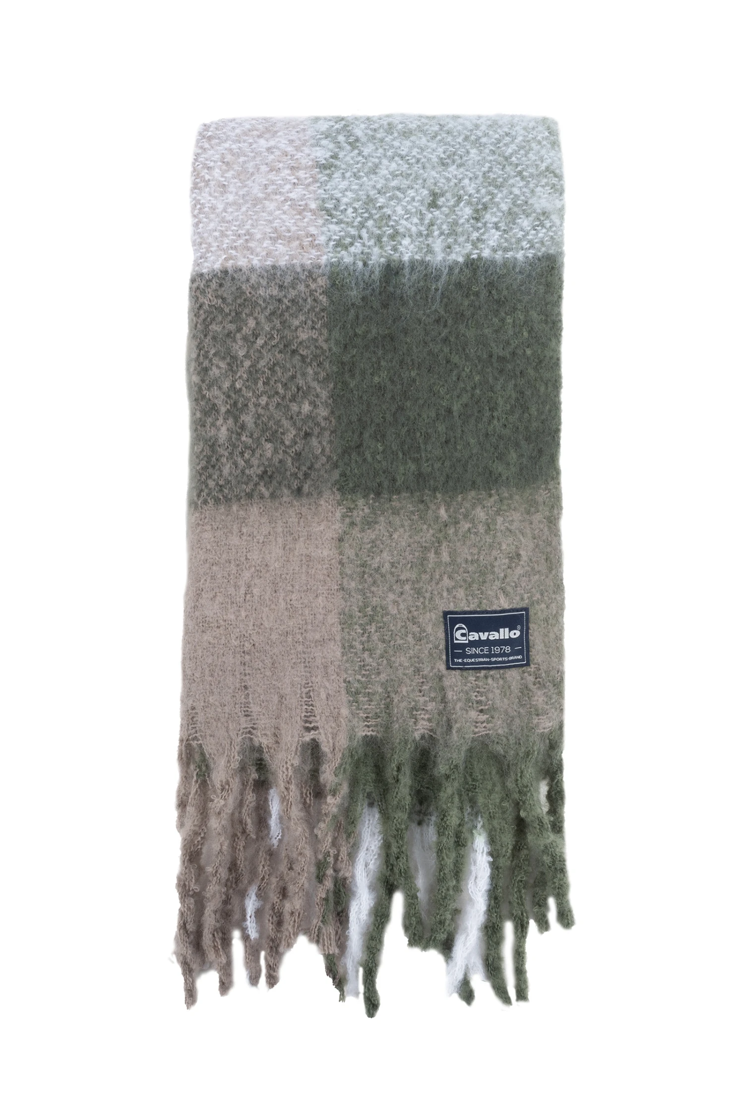 Langer, breiter Fransenschal. Modernes Karodesign. Extra kuschelig. Cavallo Weblabel am Schalende.