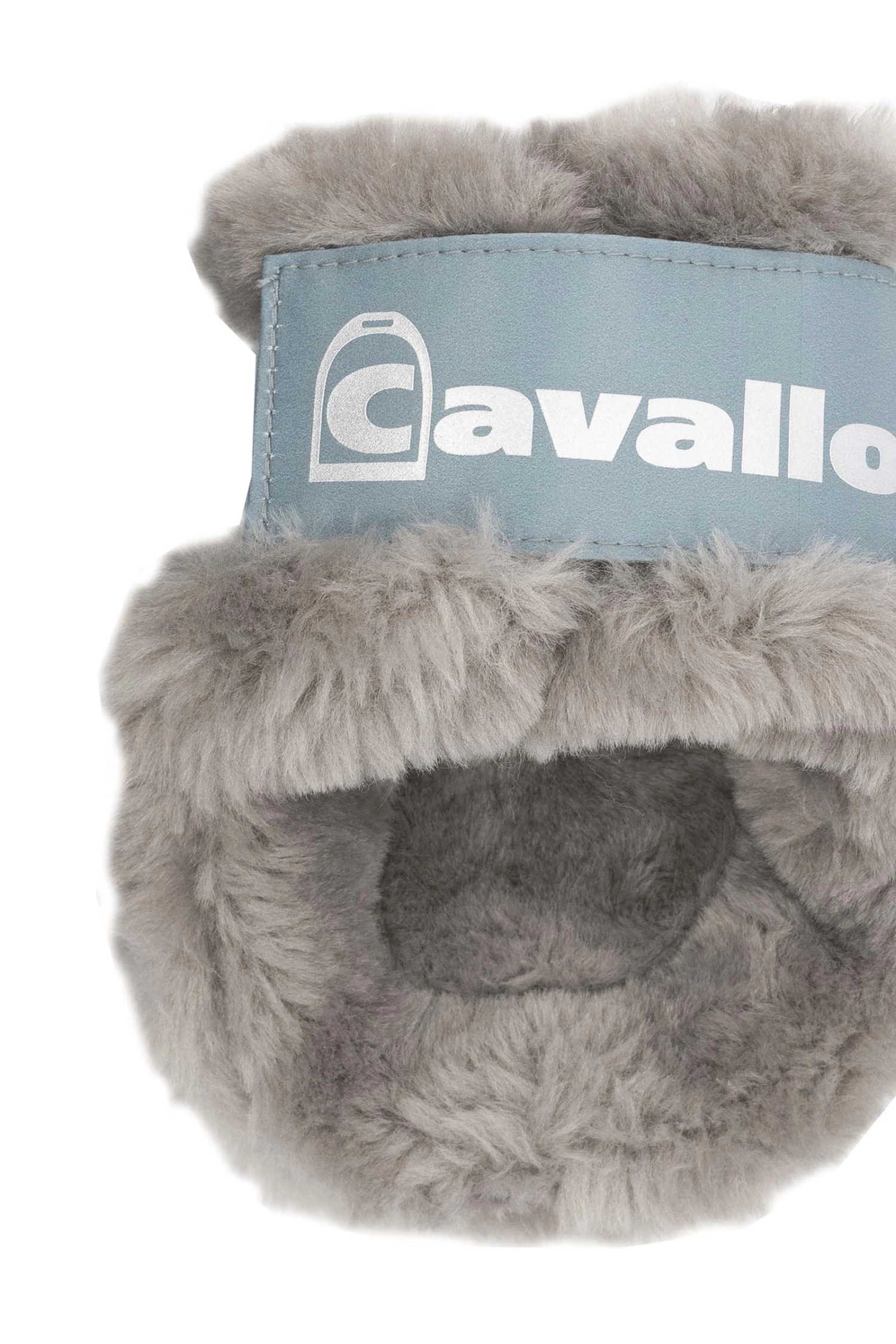 Die Innenseite der Streichkappen sind mit flauschigem Kunstfell gefüttert. Die Streichkappen sind mit einem breiten Gummiband und Flauschband zum Verschließen an der Außenseite versehen. Auf der Oberseite des Klettbandes ist ein großes, silbernes Cavallo Logo aufgedruckt. Die Innenseite der Streichkappe ist mit einem großen Cavallo Steigbügel Logo bedruckt.