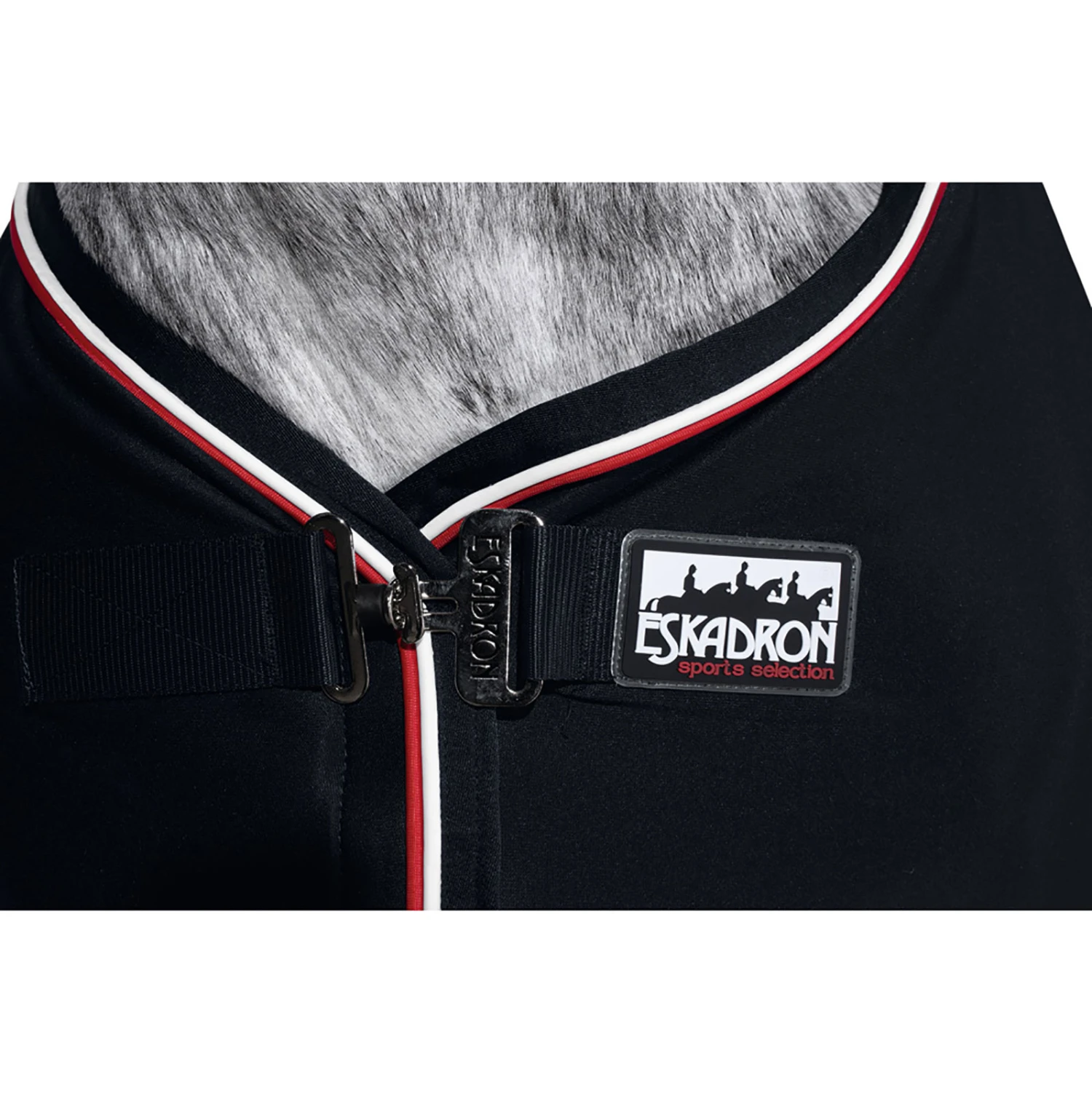 Ein echter Allrounder! Eine funktionelle Abschwitzdecke aus atmungsaktivem und elatischem Jersey Material. Beidseitige Sports Selection Streifen, linksseitig mit Eskadron Stickapplikation. Auf der glatten Oberseite verfängt sich weniger Stroh und Späne, während die angeraute Innenseite für optimalen Feuchtigkeitstransport sorgt. Die abnehmbare Kreuzbegurtung sorgt für sicheren Sitz beim Transport.