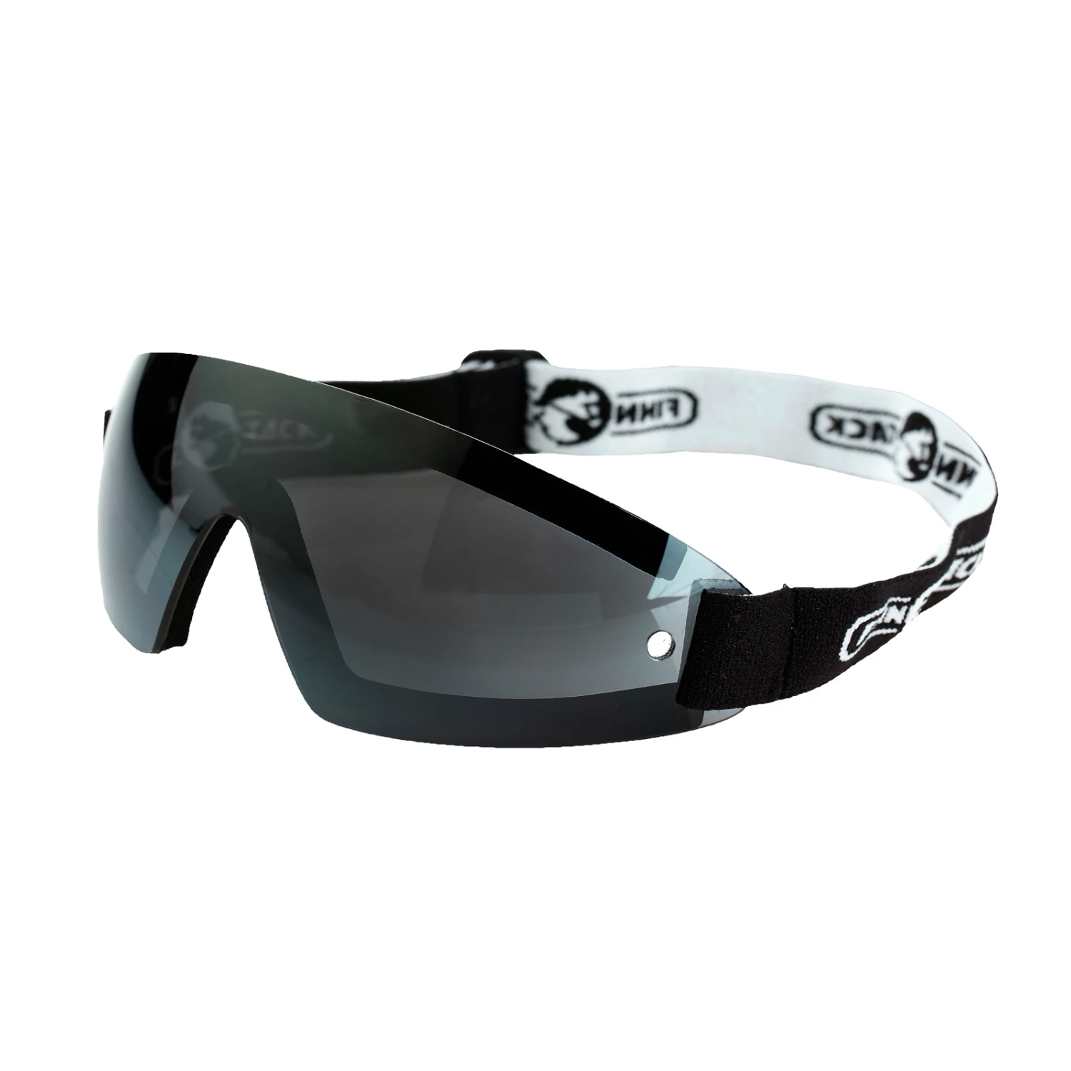 Fahr-Brille mit Beschlagsschutz und Entspiegelung der Gläser. Die Gläser sind aus Poly Carbonat mit UV-Schutz 400 hergestellt. Elastisches Band mit Finn Tack Logo.