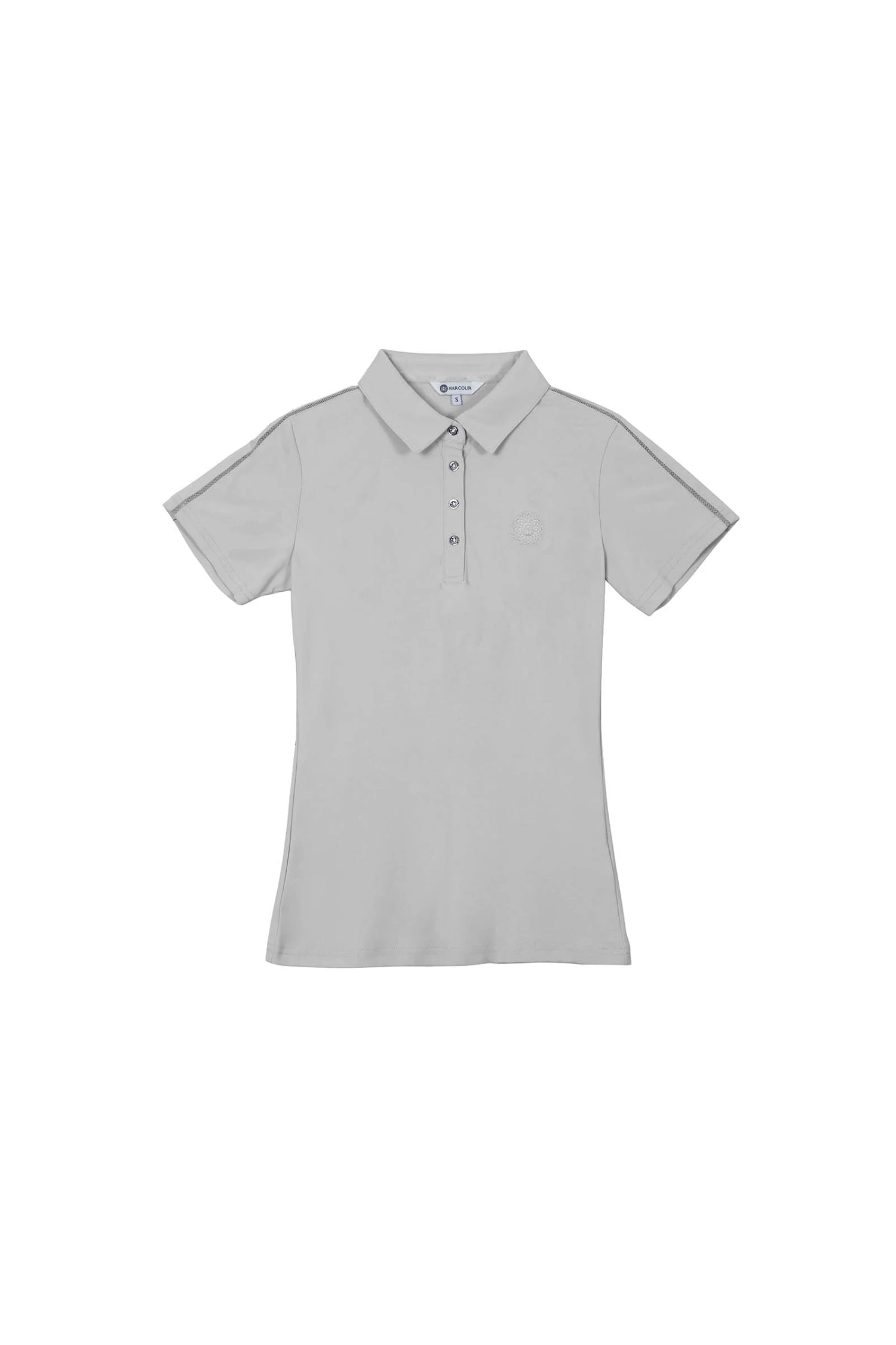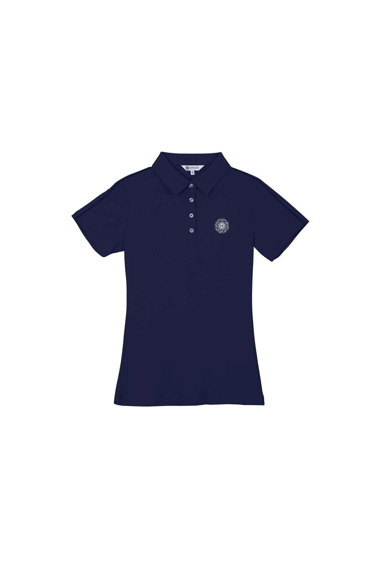 Das Polo wird mit Druckknöpfen auf der Vorderseite geschlossen. Auf der Rückseite befindet sich außerdem ein Knopf mit dem Logo.
