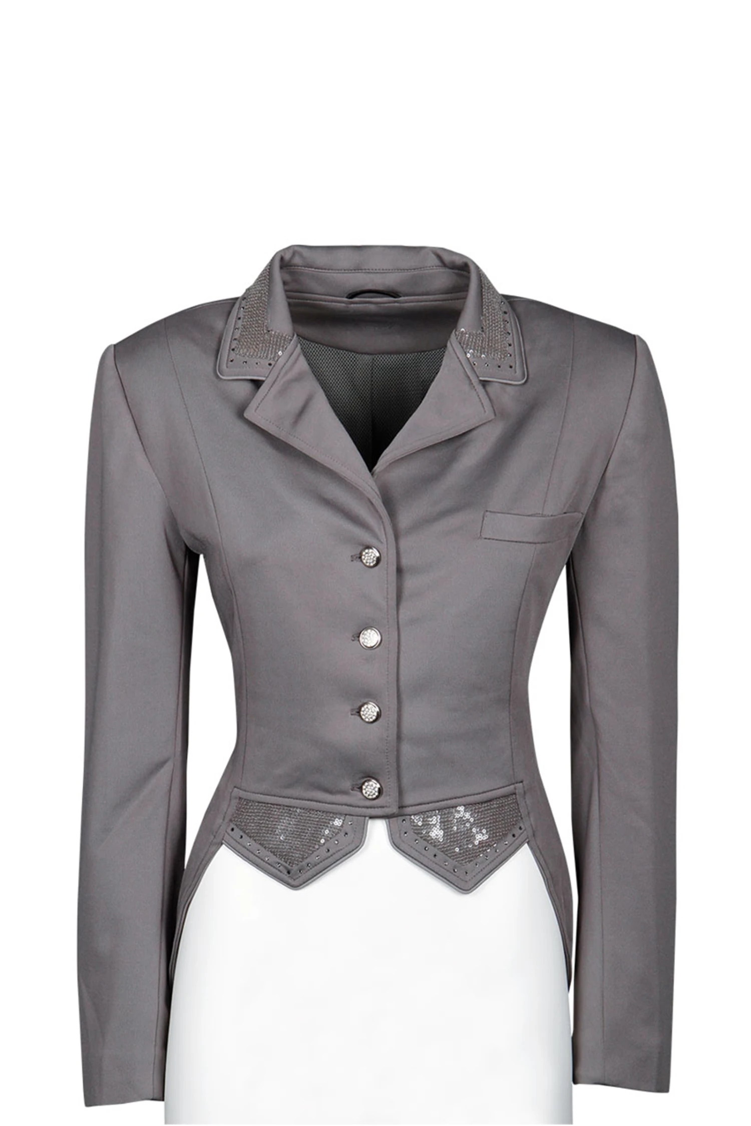 Edles Turnierjackett aus hochwertigem Stretch-Material. Die Jacke ist mit einem Kristallknopf und darunter liegendem Reißverschluss für perfekte Passform ausgestattet, am Kragen und den Gehschlitzen sind farblich passende Pailletten/Kristalle und eine Paspel angebracht. Mit Zierknöpfen.