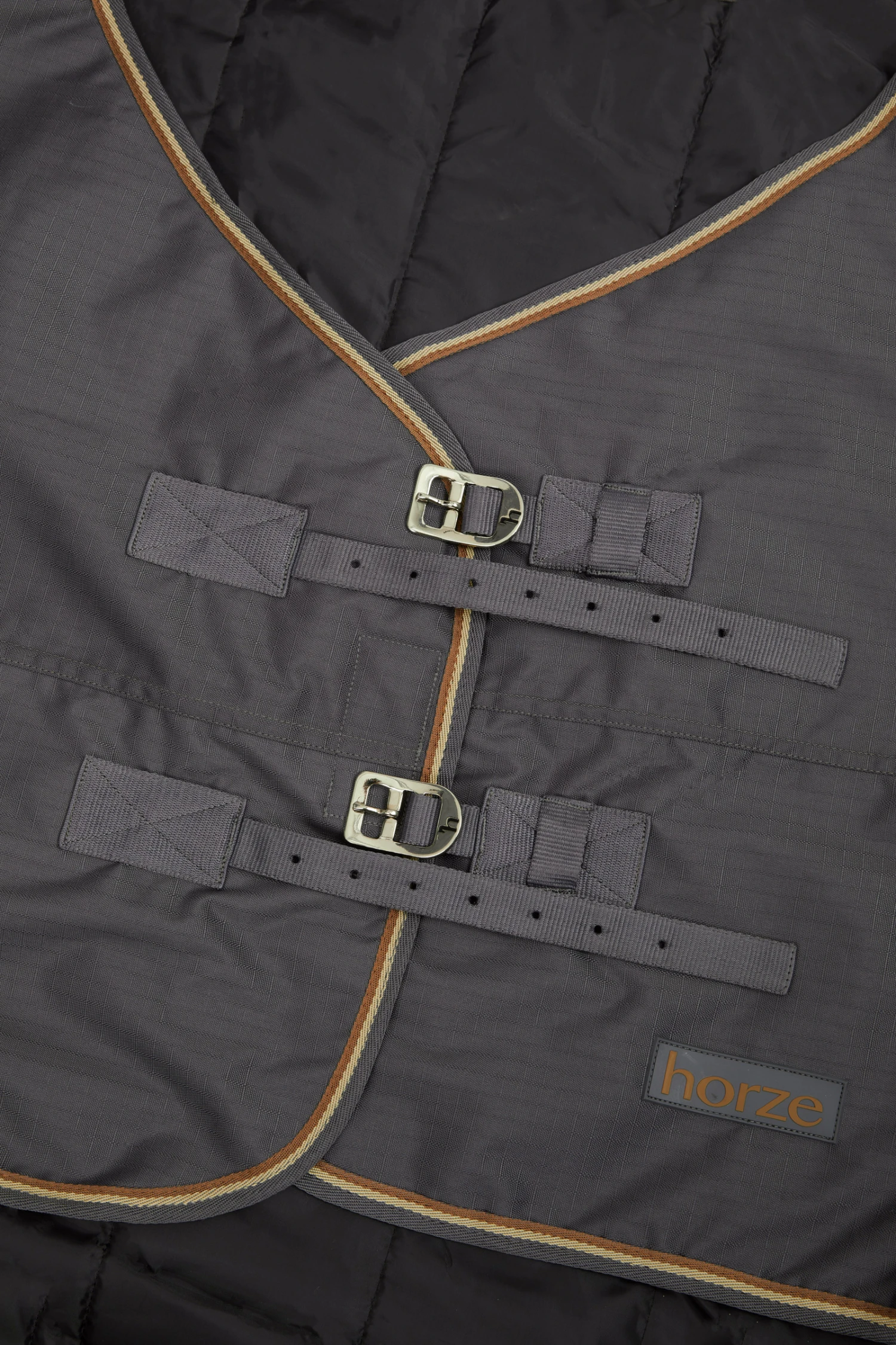 Diese Decke mit Halsteil ist aus wasserdichtem, atmungsaktivem Material gefertigt. Der gute Sitz an Hals und Schultern macht sie bequem und die hohen Gehfalten bieten Bewegungsfreiheit, damit sich dein Pferd austoben kann und nicht eingeschränkt wird. Frontverschlüsse, Kreuzgurte und Beinschnüre halten die Decke sicher an ihrem Platz und verhindern Verrutschen.