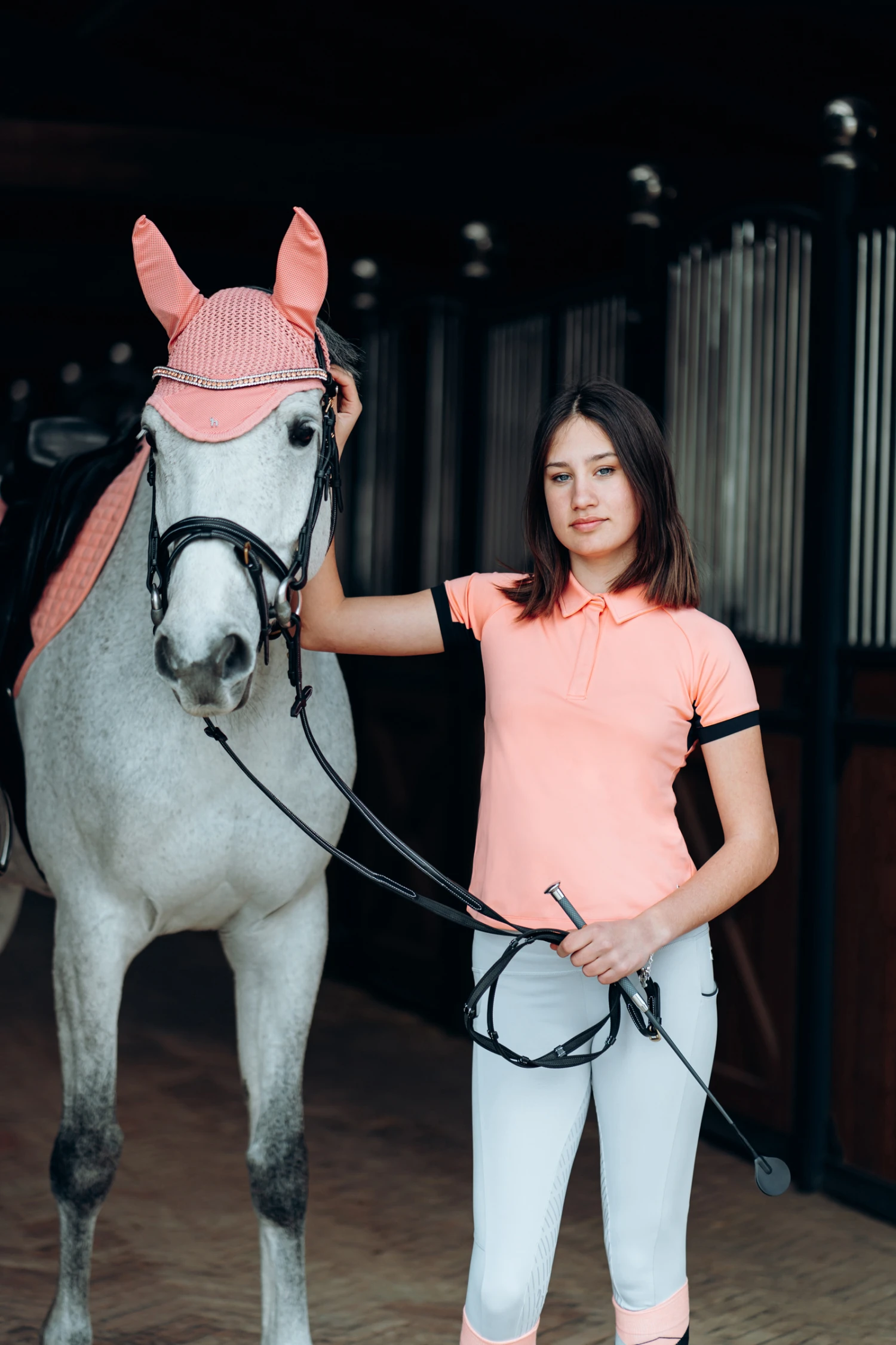 Das Horze Laura Shirt ist perfekt für aktive Tage: Im täglichen Training, der Zeit im Stall und auf Sommerausritten. Mesh unter den Achseln hält junge Reiter kühl und der stützende Stoff fühlt sich weich auf der Haut an. Die sommerliche Farben können leicht in die saisonale Garderobe integriert werden. Der klassische Schnitt ist sportlich und zeitlos. Ein kleines Metall-Logo am Bund und das reflektierende Logo auf dem Rücken stechen ins Auge.