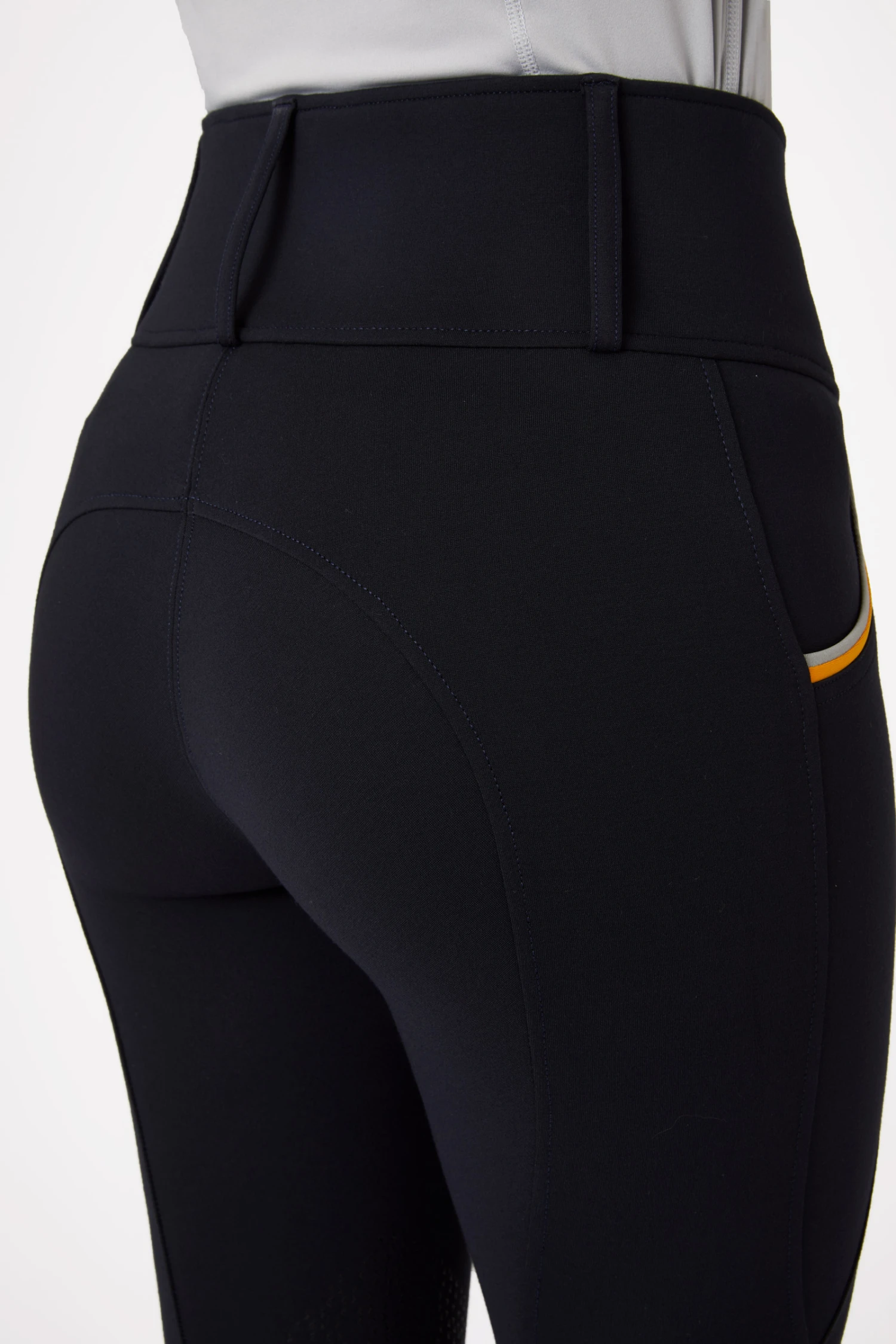 Schlichte Reithose mit auffälligen Paspeln an den Vordertaschen.