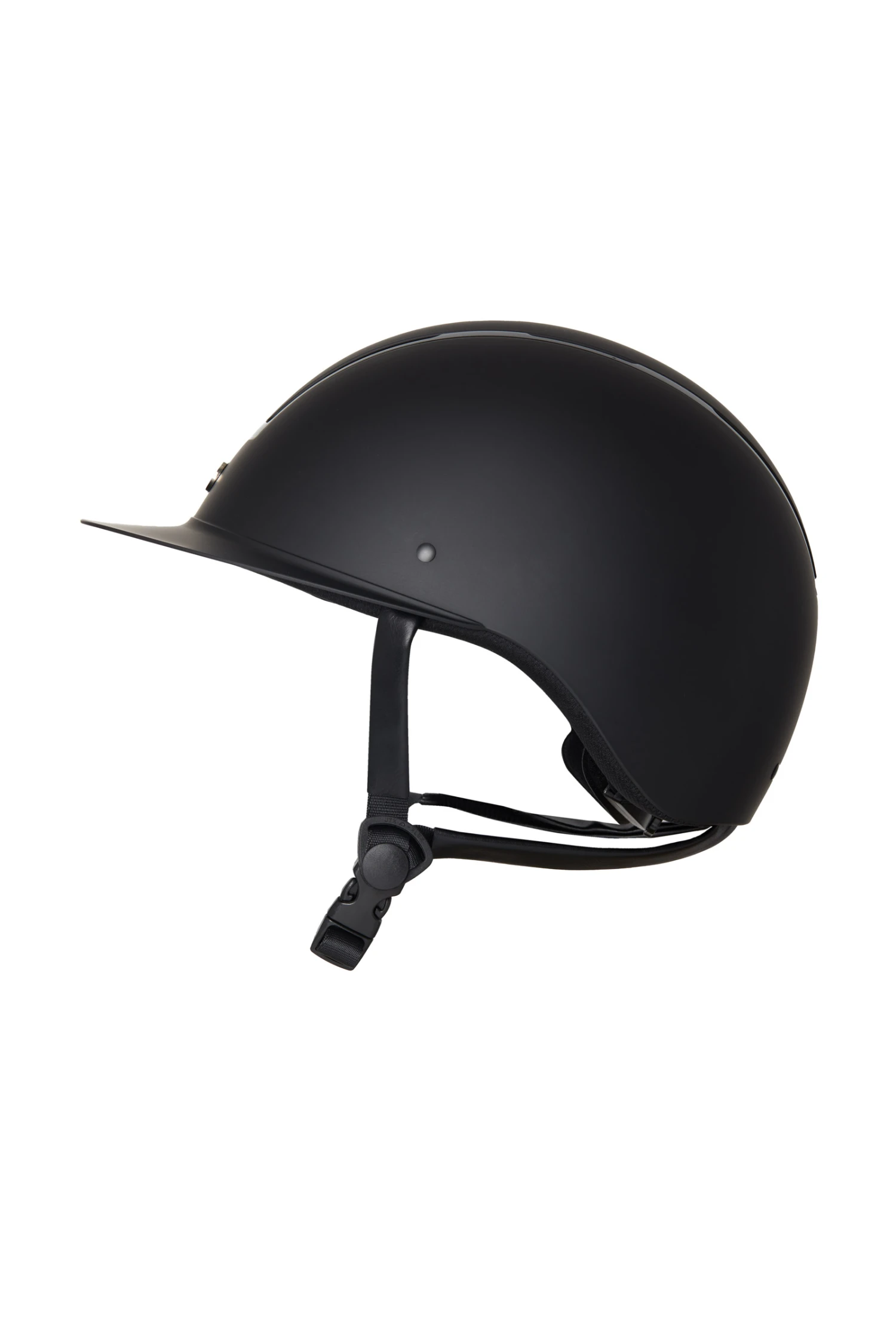 Der Horze Noir Reithelm besticht durch seine Hochwertigkeit sowohl im Design als auch im technischen Standard. Die glatte Außenschale hält starken Stößen stand, während der Memory Foam sie im Falle eines Sturzes abfedert. Die Memory-Schaumstoff-Polsterung leitet jegliche Feuchtigkeit ab und ist bequem. Der glänzende Rahmen mit Lüftungsschlitzen ermöglicht eine optimale Luftzirkulation. Der Verschluss ist mit einem weichen Halsschutz versehen und die Schnellverschlussschnalle ist einfach zu bedienen. Eine breite Krempe schützt deine Augen vor der Sonne. Stell den Noir-Helm mit unserem Wählscheibensystem für die perfekte Passform ein.