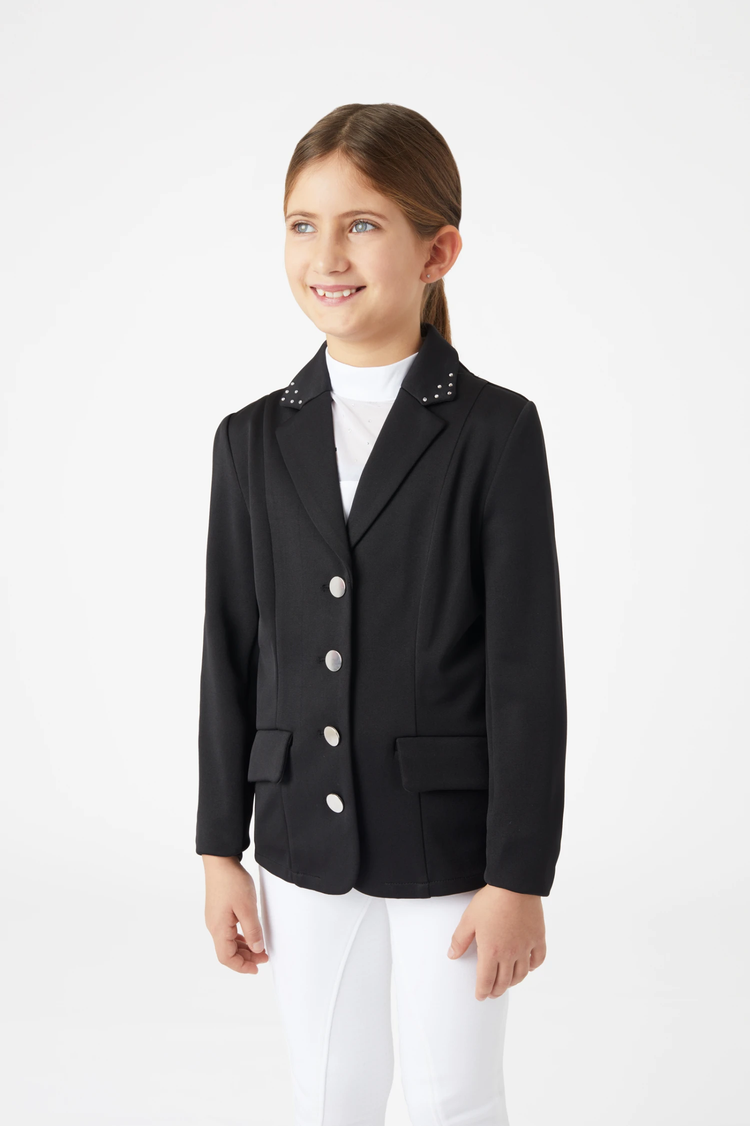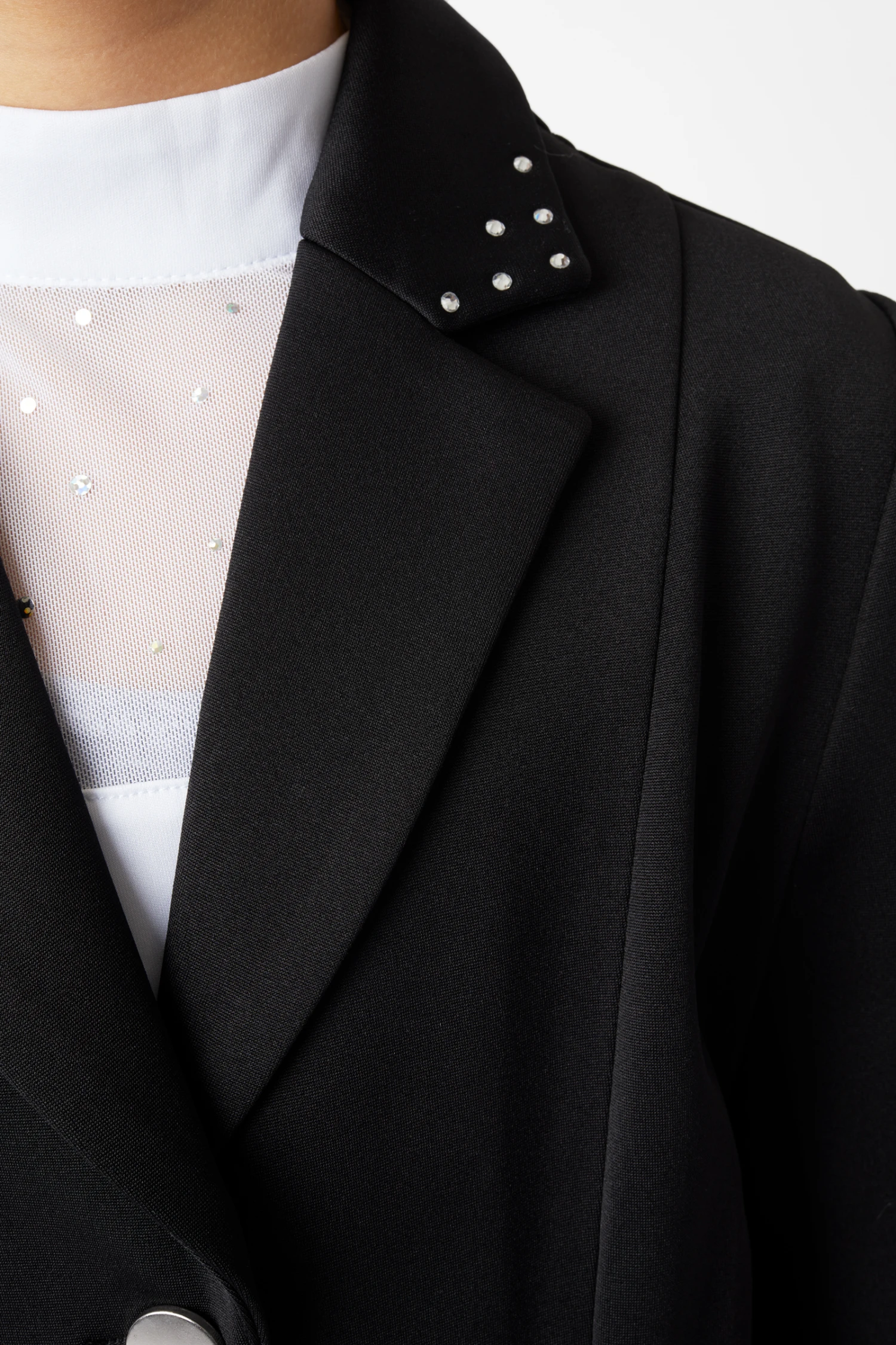 Dein Kind nimmt an den ersten Turnieren teil? Egal ob Dressur oder Springen, dieses Turnierjackett mit seinem traditionellen Schnitt und den Strasssteinen am Kragen ist die perfekte Wahl für junge Mädchen, die gerne ein bisschen funkeln. Die Jacke lässt sich mit einem Knopf schließen, hat zwei Pattentaschen und Schlitze auf der Rückseite für mehr Bewegungsfreiheit beim Reiten. Kleiner ‚h‘-Metallanhänger auf der linken Taschenklappe.