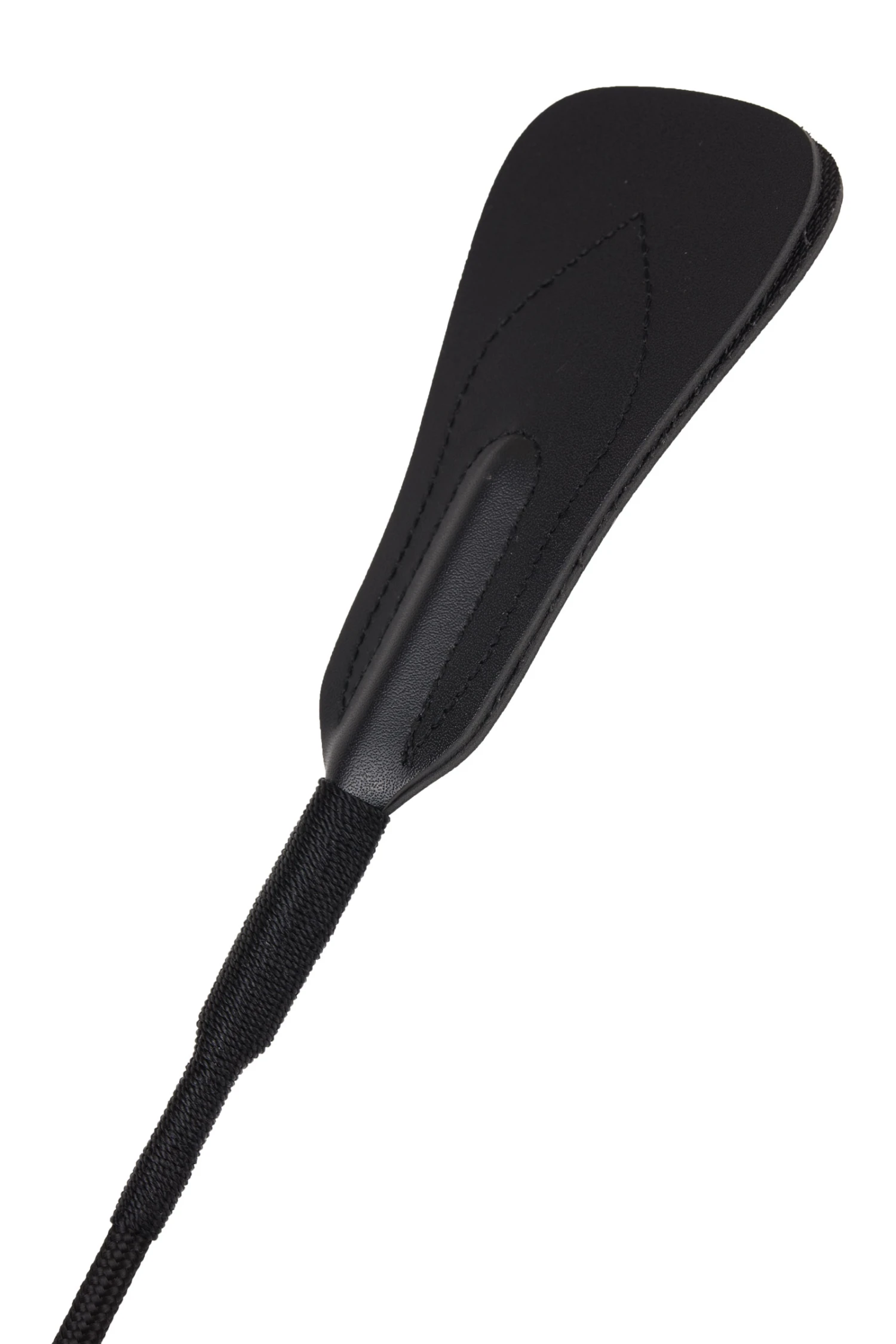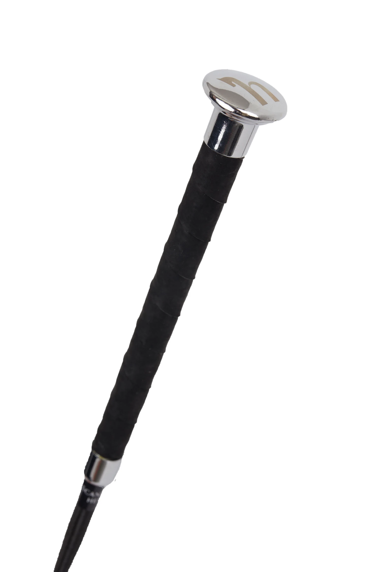 Reitstock mit geflochtenem Griff. Lederklatsche. Nylonschaft. Metallkappe mit Logo.