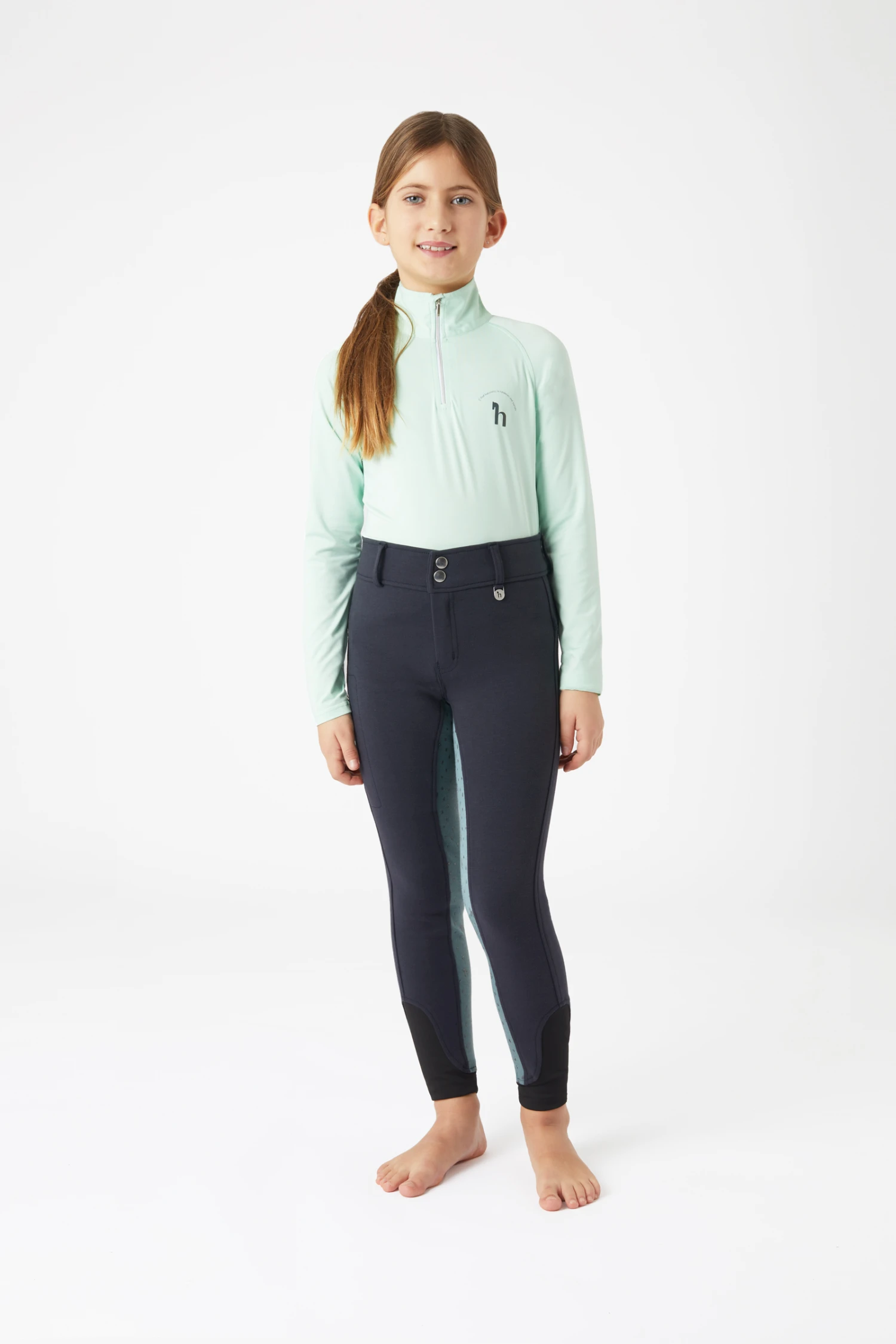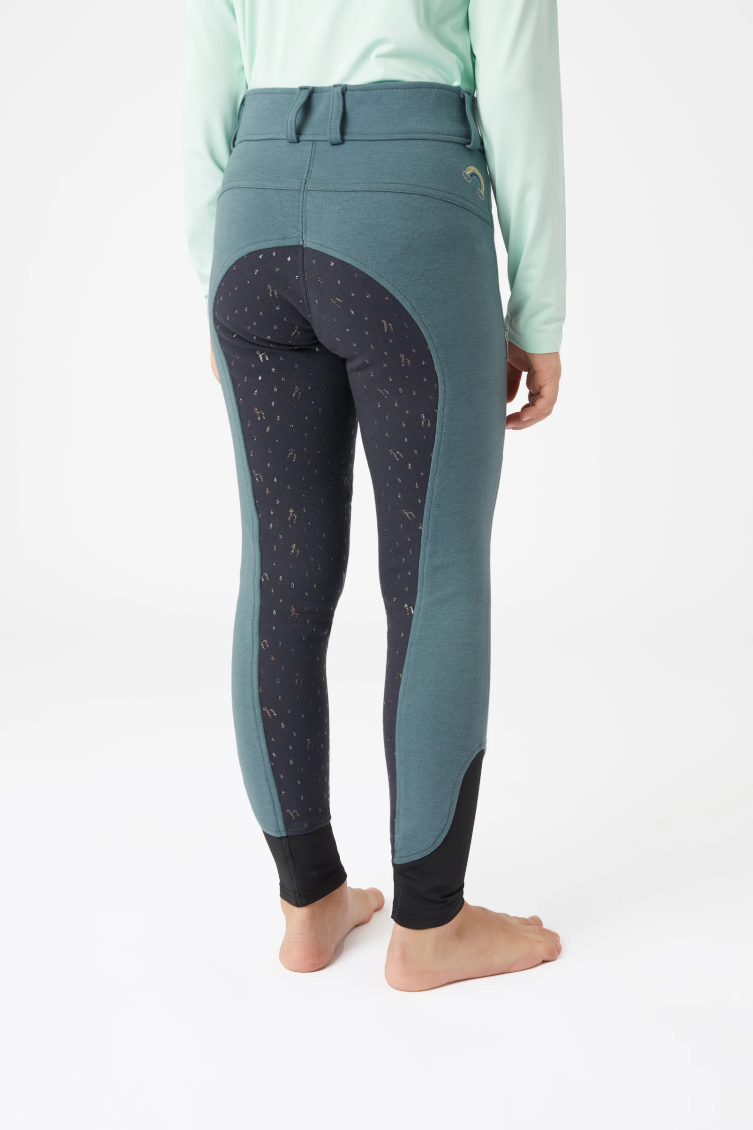 Die perfekte Reithose für junge Mädchen, die sich gerne farbenfroh kleiden. Der Silikonvollgrip in pastelligen Regenbogenfarben hat die Form von Regentropfen und kleinen ‚h‘-Logos. Unterhalb des hinteren Bunds ist eine zarte Regenbogenstickerei angebracht. Elastische Beinbündchen sorgen für mehr Tragekomfort und weniger Volumen unter den Stiefeln. Dank der Gürtelschlaufen kann die Reithose mit einem Gürtel deiner Wahl getragen werden. Eine Reißverschlusstasche am rechten Oberschenkel bietet genügend Platz für das Handy.