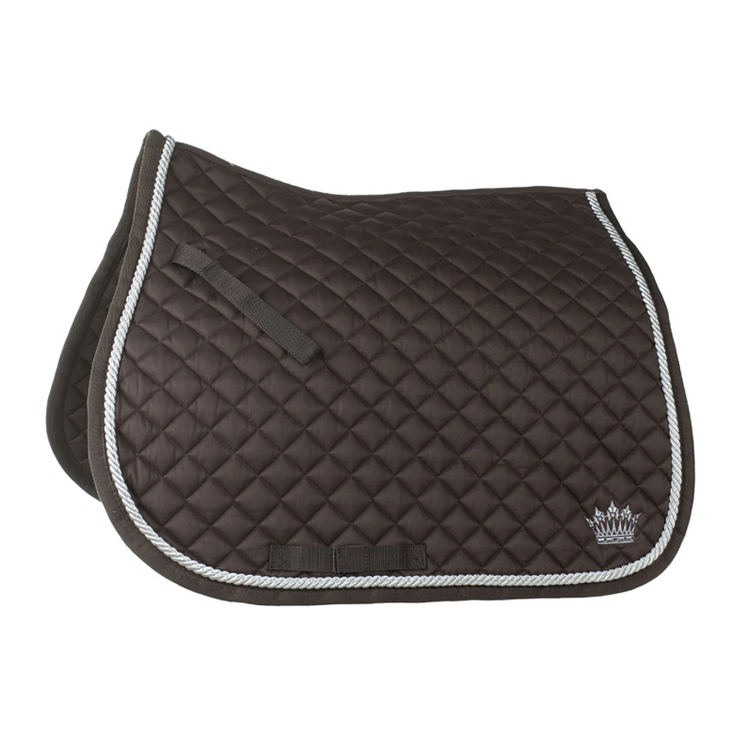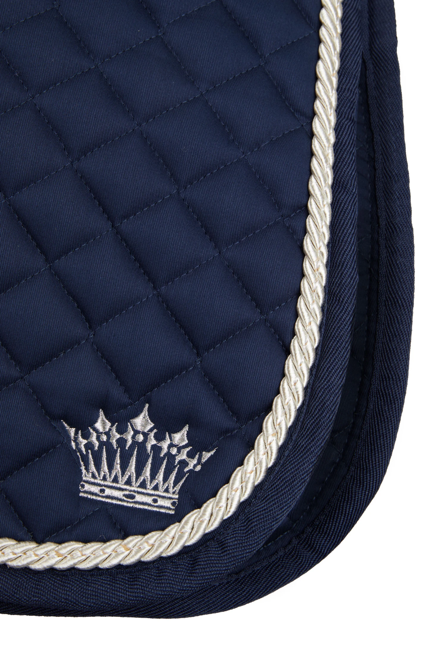 Starke, robuste Silberkordel fasst diese attraktive Vielseitigkeitsschabracke ein. Die wunderschöne, diamantförmige Steppung, ergonomische Form und außergewöhnliche Liebe zum Detail machen dieses Pad einzigartig. Dieses Pad wirkt wie eine schützende Barriere zwischen Sattel und Pferderücken. Das Pad ist luxuriös weich mit atmungsaktiver Fütterung aus Baumwolle um Feuchtigkeit vom Rücken abzutransportieren und für kühlen Komfort zu sorgen. Das konturierte Pad passt sich der natürlichen Form des Pferdes an und eliminiert so Reibungen und sorgt für mehr Entlastung im Bereich des Widerrists für noch mehr Komfort. Eine silber gestickte Krone sitzt im hinteren Eck und passt zu der Einfassung mit Kordel. Ihr Pferd wird von jedem im Stall beneidet werden wenn es dieses tolle Sattelpad trägt! Mit Ihrem Namen oder Ihren Initialen aufgestickt wird es sehr persönlich aussehen!