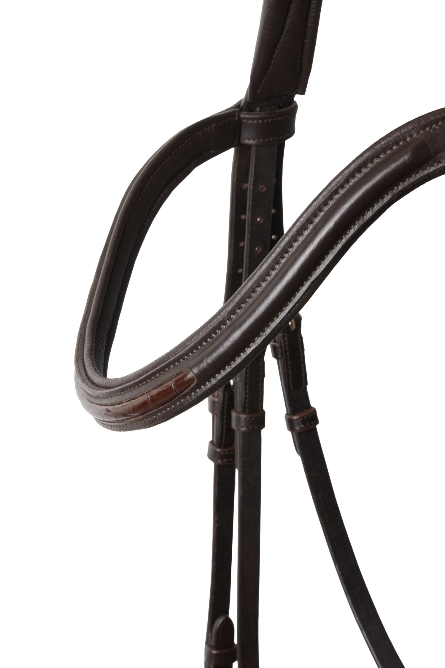 Die Trense ist mit einem gepolsterten anatomischen Kopfstück und einem schwedischen Reithalfter ausgestattet, die sorgfältig entwickelt wurden, um maximalen Komfort zu bieten und den Druck auf empfindliche Bereiche des Pferdekopfes zu verringern. Das sorgt für eine angenehme und ergonomische Passform für dein Pferd. Der Sperrriemen kann abgenommen werden, wenn du lieber ohne ihn reitest. Um den Look deines Pferdes zu individualisieren, kann der Stirnriemen leicht entfernt und ausgetauscht werden. Mit den Kroko-Lackdetails im Stirn- und Nasenriemen ist diese Trense ein echter Hingucker auf Turnieren und beim Training.
