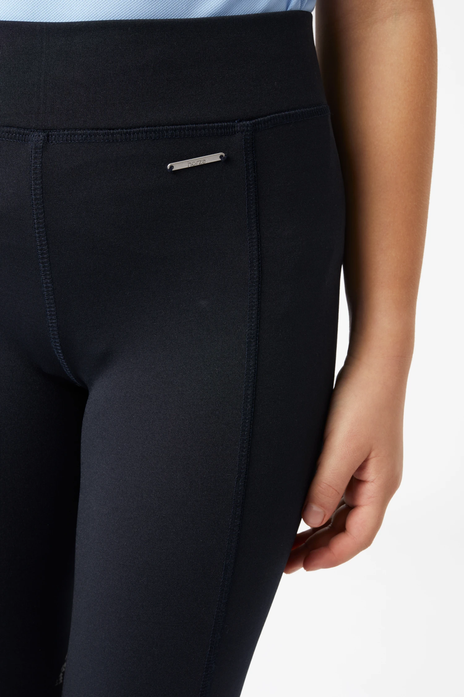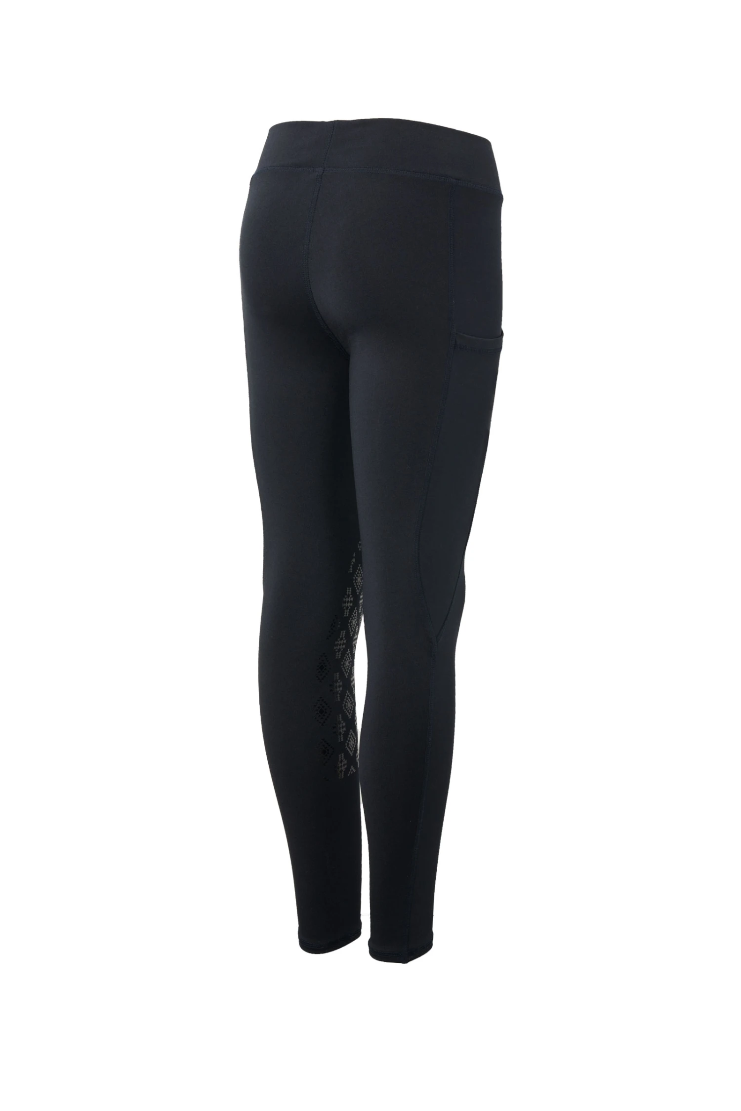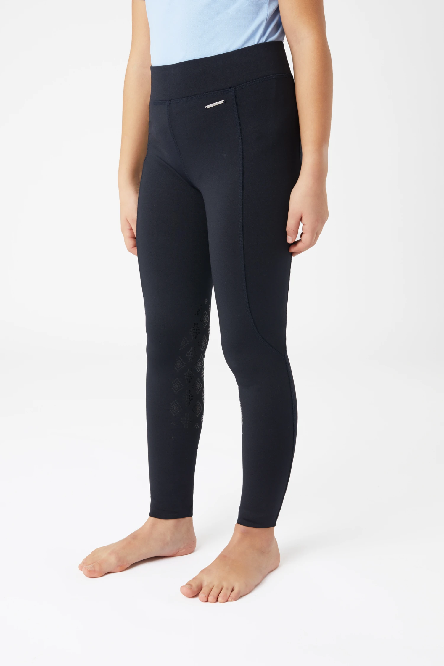 Eine klassische Kinder-Reitleggings aus weichem, dehnbarem Stoff für hohen Tragekomfort. Der Kniegrip ist mit einem zarten Aztekenmuster bedruckt. Am linken Oberschenkel bietet eine große Tasche Platz für das Handy deines Kindes. Ein kleiner Logo-Metallanhänger befindet sich auf der linken Vorderseite unterhalb des Bunds.