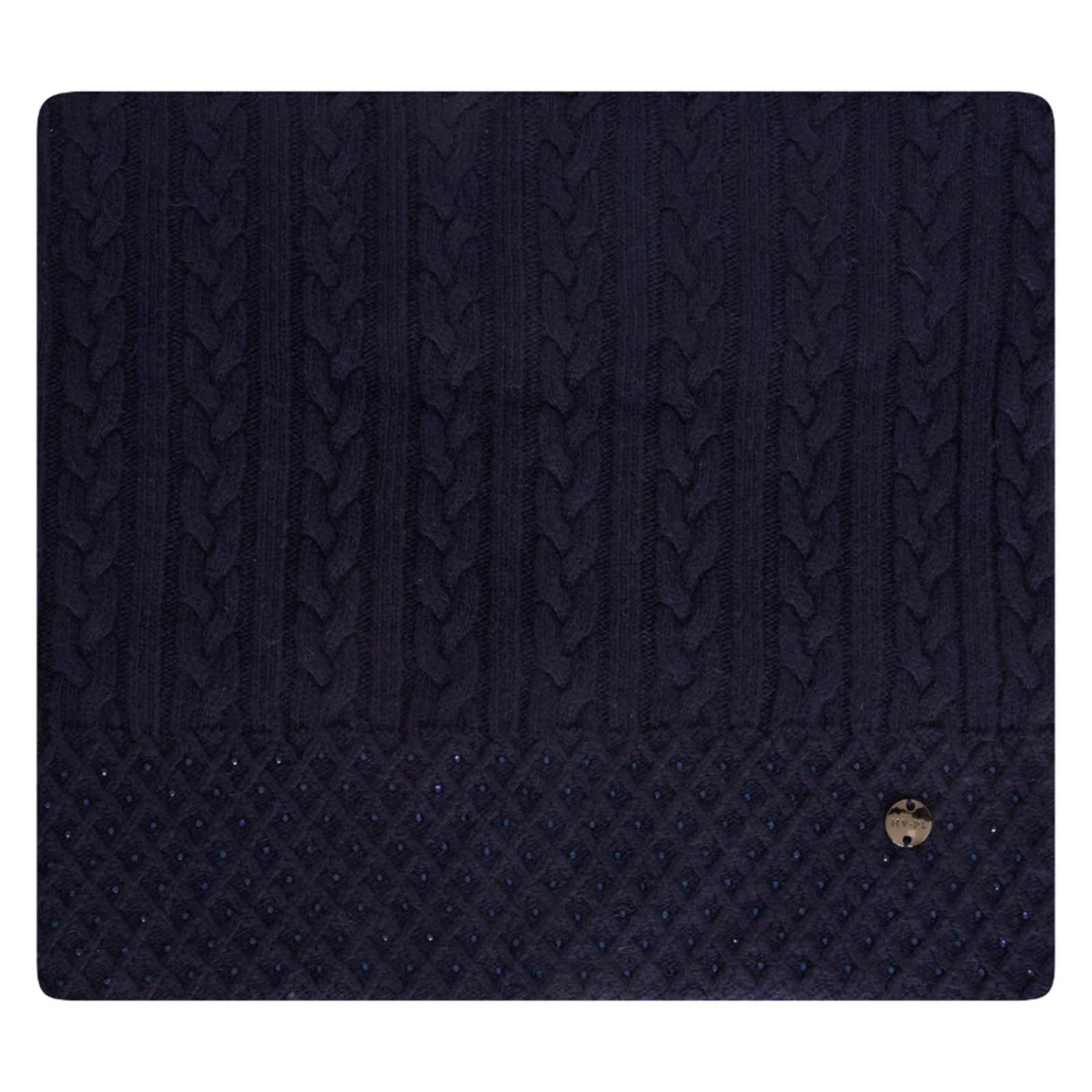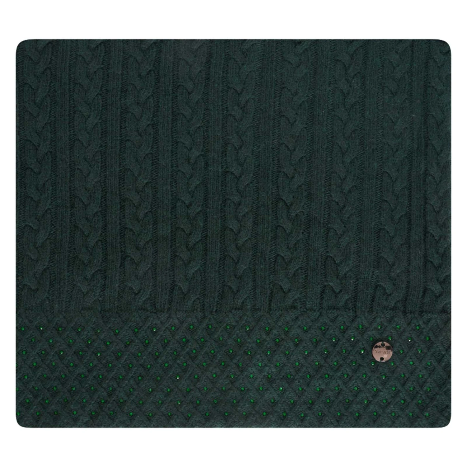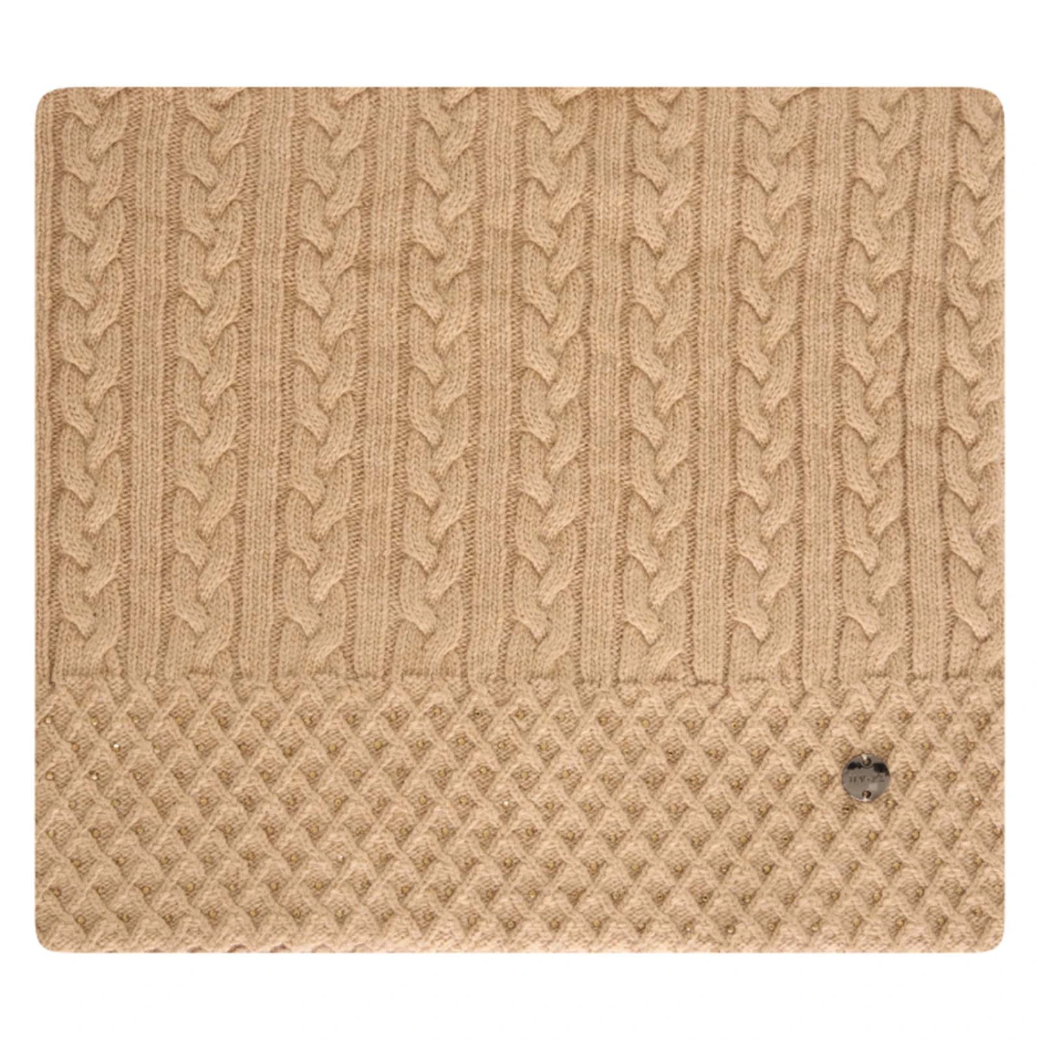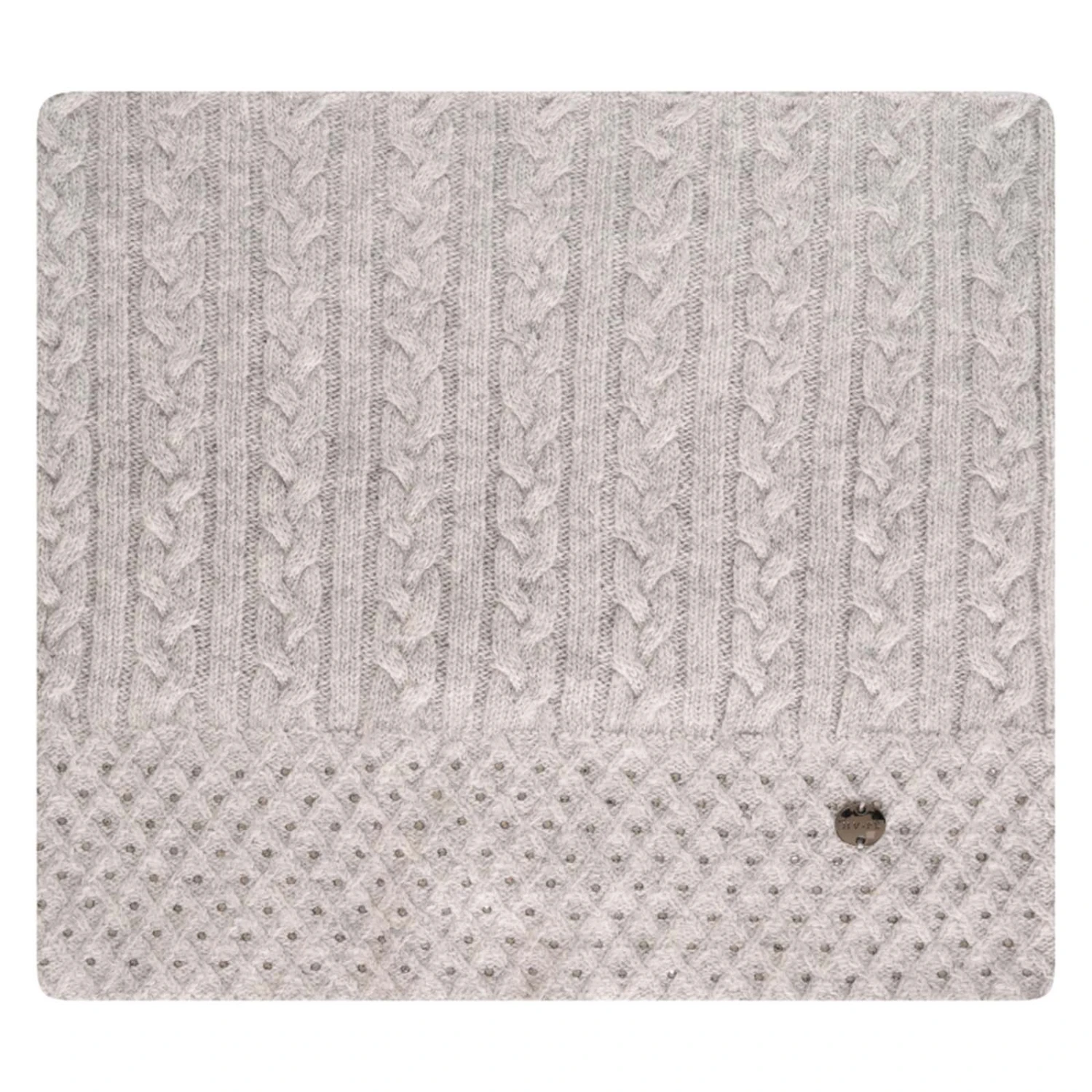 Gestrickter Schlaufenschal mit Zopfmuster und Strasssteinen.