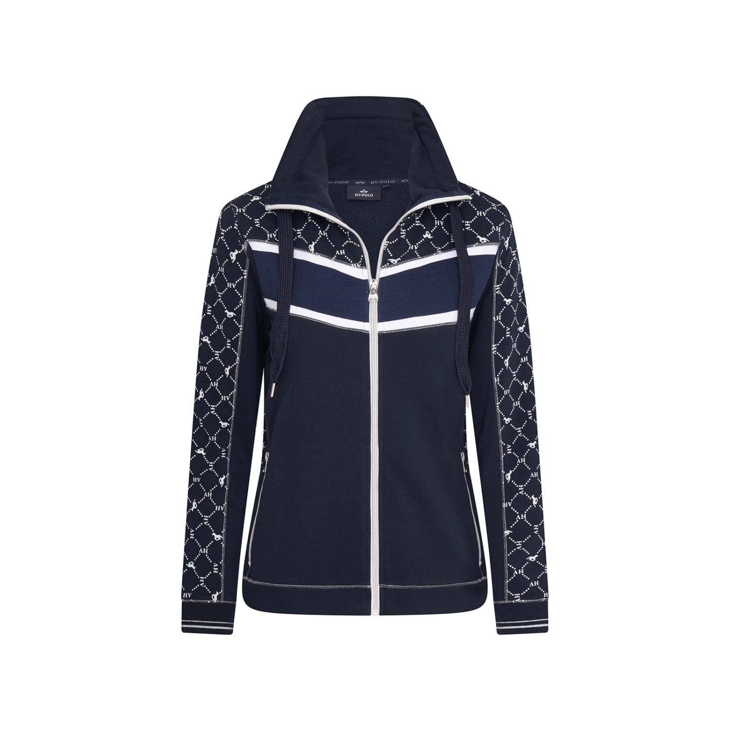 Schicke Sweatshirt-Jacke mit durchgehendem Reißverschluss und modischem Kragen. Einsatz in Colourblock-Optik mit Allover-Print „Welmoed“. Silberfarbene Lurex-Streifen am Bündchen und kleiner Steppstich an den Nähten für einen sportlichen Look. Reißverschlusstaschen vorne und als Abschluss eine Verzierung mit einer Mischung von Strasssteinen am Kordelzug.