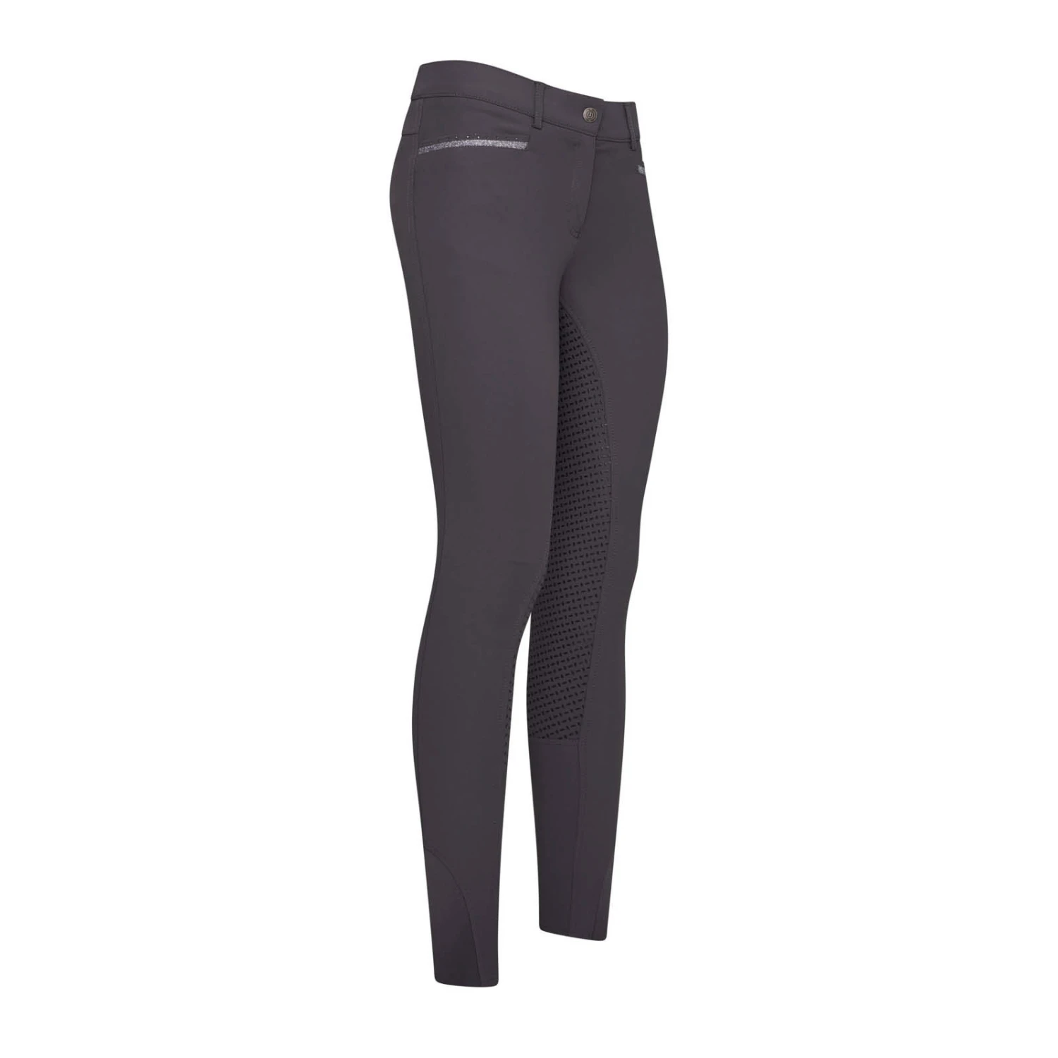 Schicke feminine Vollbesatz Reithose mit Glitzerakzenten. Die im klassischen four-pocket Stil gefertigte Reithose El Capone mit Vollbesatz aus Silikon bietet perfekten Reit-Komfort und ist ein echter Hingucker; dafür sorgen die mit Strasssteinen und Glitzer-Applikationen verzierten Vorder- und Hintertaschen, die zwei ebenfalls mit Glitzerfoliendruck verzierten hinteren Gürtelschlaufen sowie der im farblichen Kontrast gehaltene Silikonbesatz im Beans Design. Ein Logo in Glitzerfoliendruck ist am Vorderbein aufgebracht. Auf dem Bund befindet sich ein Knopf mit geprägtem IR Logo. Die hochwertig verarbeiteten, farblich kontrastierenden Beinenden sind elastisch.