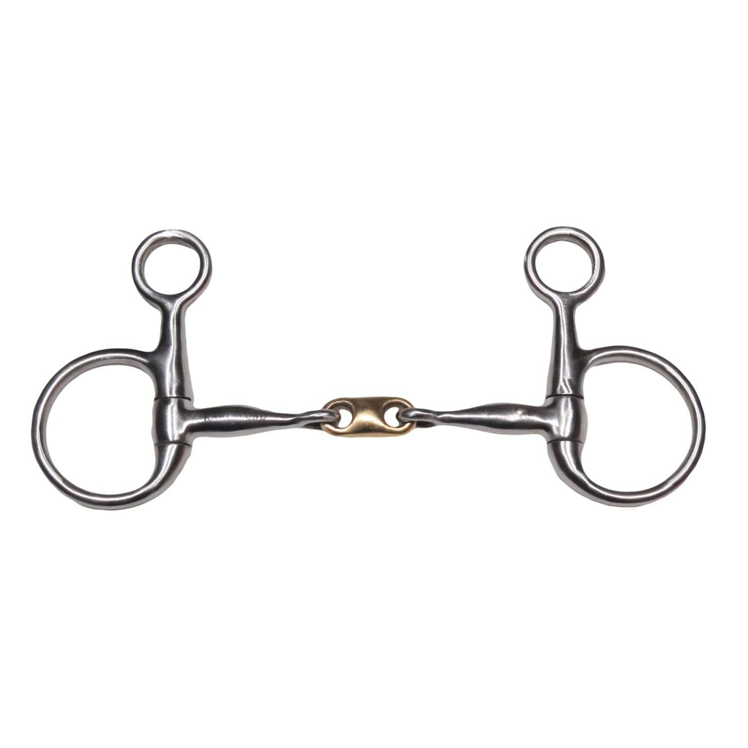 Doppelt-gebrochenes B-Gebiss mit einfacher Korrektur, aus gebürstetem Edelstahl und mit einem Kupfereinsatz in der Mitte.
