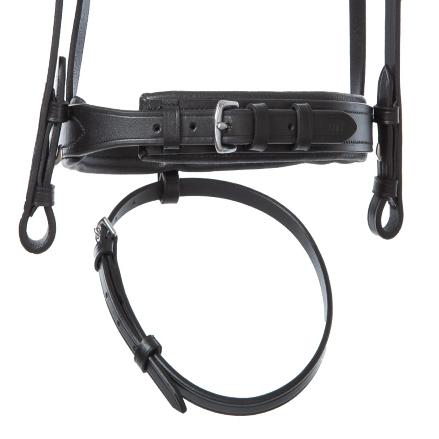 Um Druckstellen zu vermeiden, verläuft die Öse zwischen dem Nasenriemen und der Unterpolsterung entlang. Die Trense hat ein schmales, gebogenes Stirnband mit Clinchern. Für einen optimalen Sitz kann die Trense beidseitig verstellt werden. Geliefert wird die Trense inklusive Gurtzügeln mit Stegen.