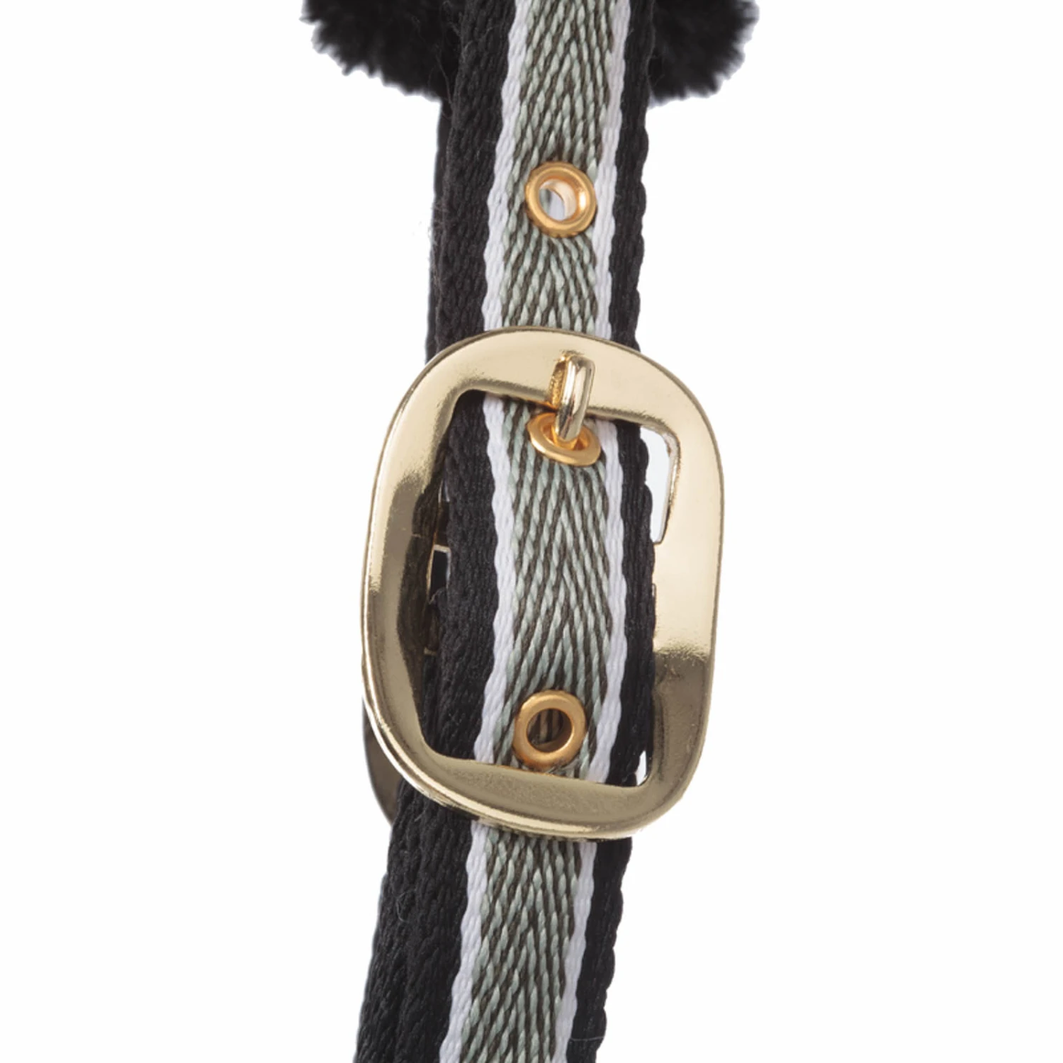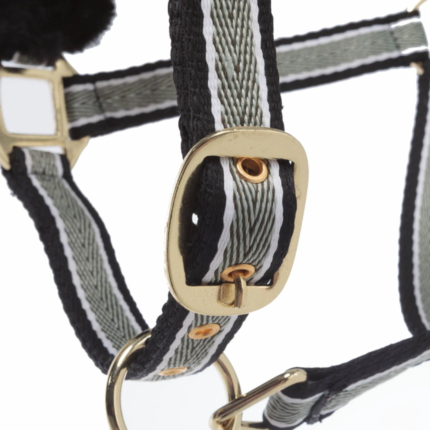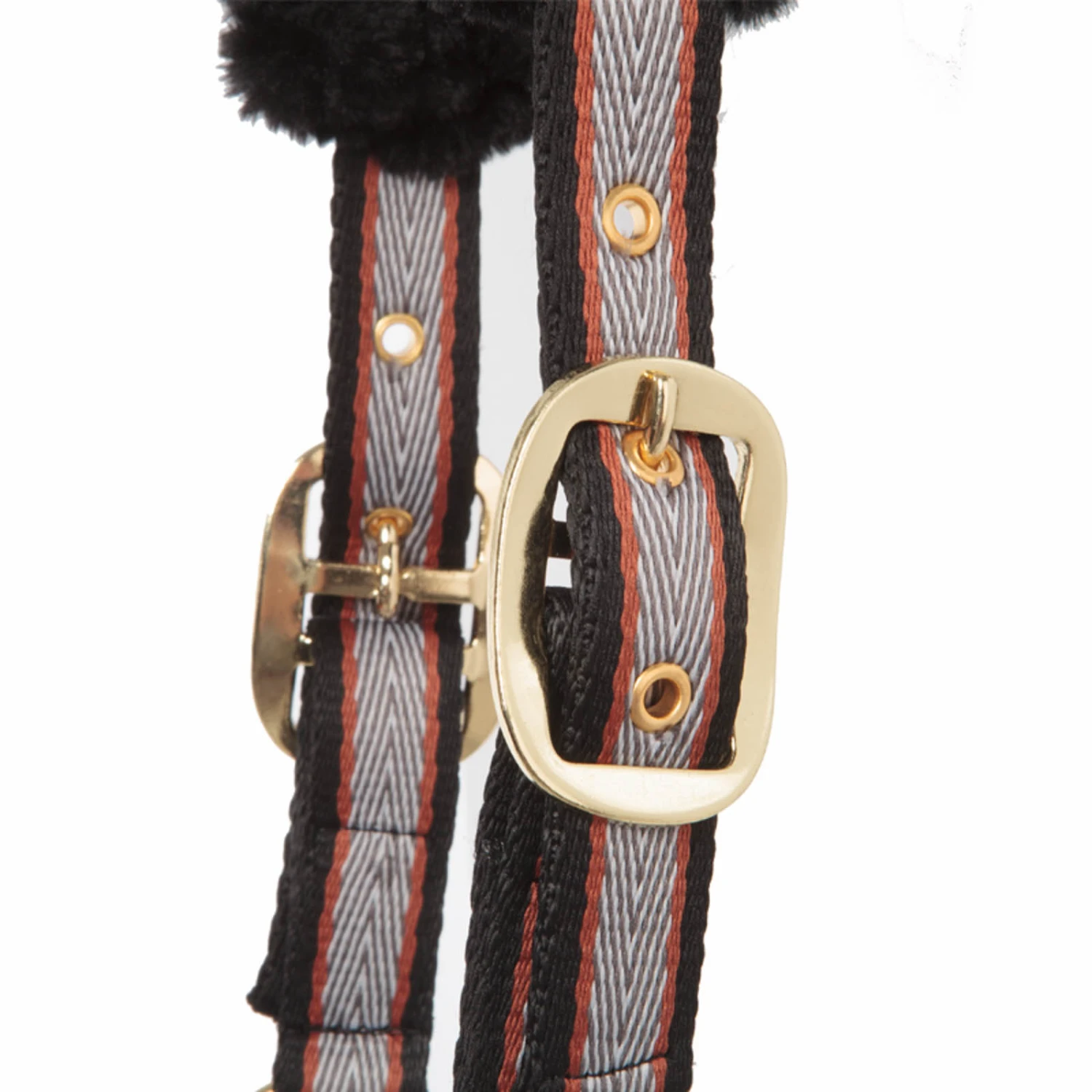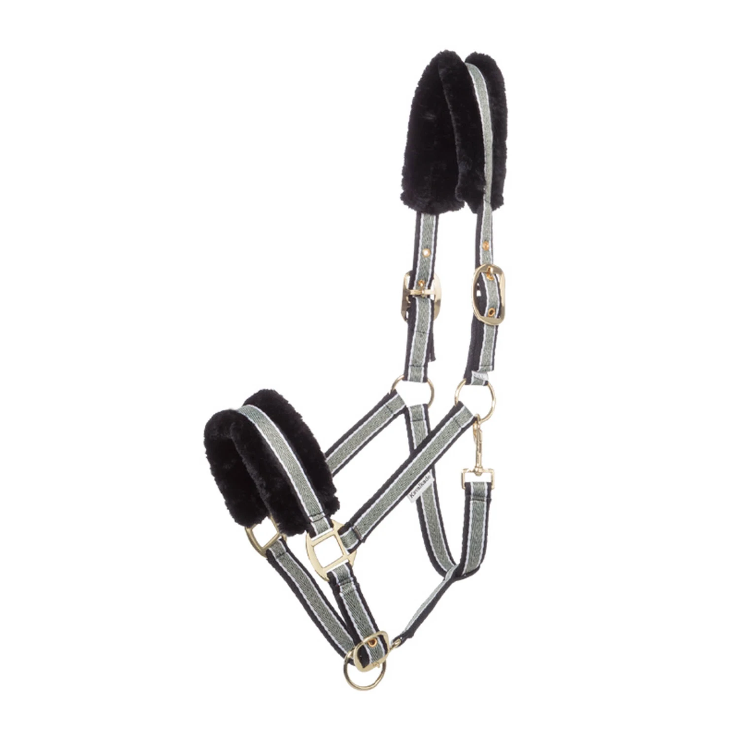 Elegantes Halfter mit weichem Kunstellpolster an Genick und Nase. Für einen perfekten Sitz kann das Halfter beidseitig sowie unten verstellt werden. Die feinen Beschläge sind Messing.
