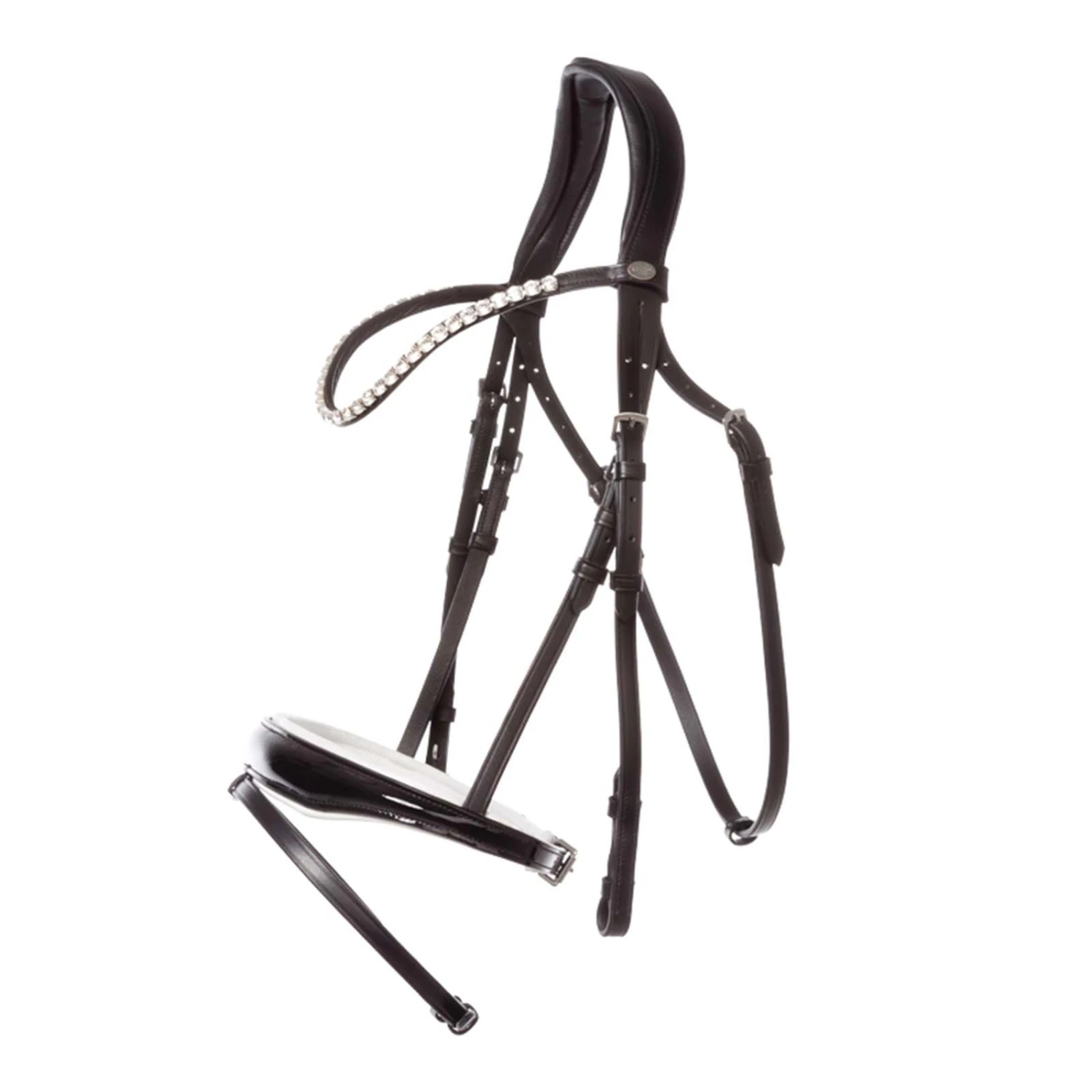 Die englisch-kombinierte Dressurtrense „Juliana“ KavalSH4 überzeugt nicht nur durch ihr schickes Aussehen, sondern auch durch höchsten Tragekomfort: Das Genickstück hat im Ohrenbereich ein Gelpadding, das besonders weich und anschmiegsam ist. Durch das weiche Padding wird der Druck im empfindlichen Ohrenbereich gedämpft. Zusätzlich hat das Genickstück eine anatomische Form, um den Ohren genügend Freiheit zu geben. Der Nasenriemen ist weich unterlegt und schmal zulaufend. Das Stirnband in seiner geschwungenden Form und den großen weißen Strasssteinen sieht an jedem Pferdekopf absolut schick aus. Der Trensenzaum wird mit schmalen Zügeln geliefert.