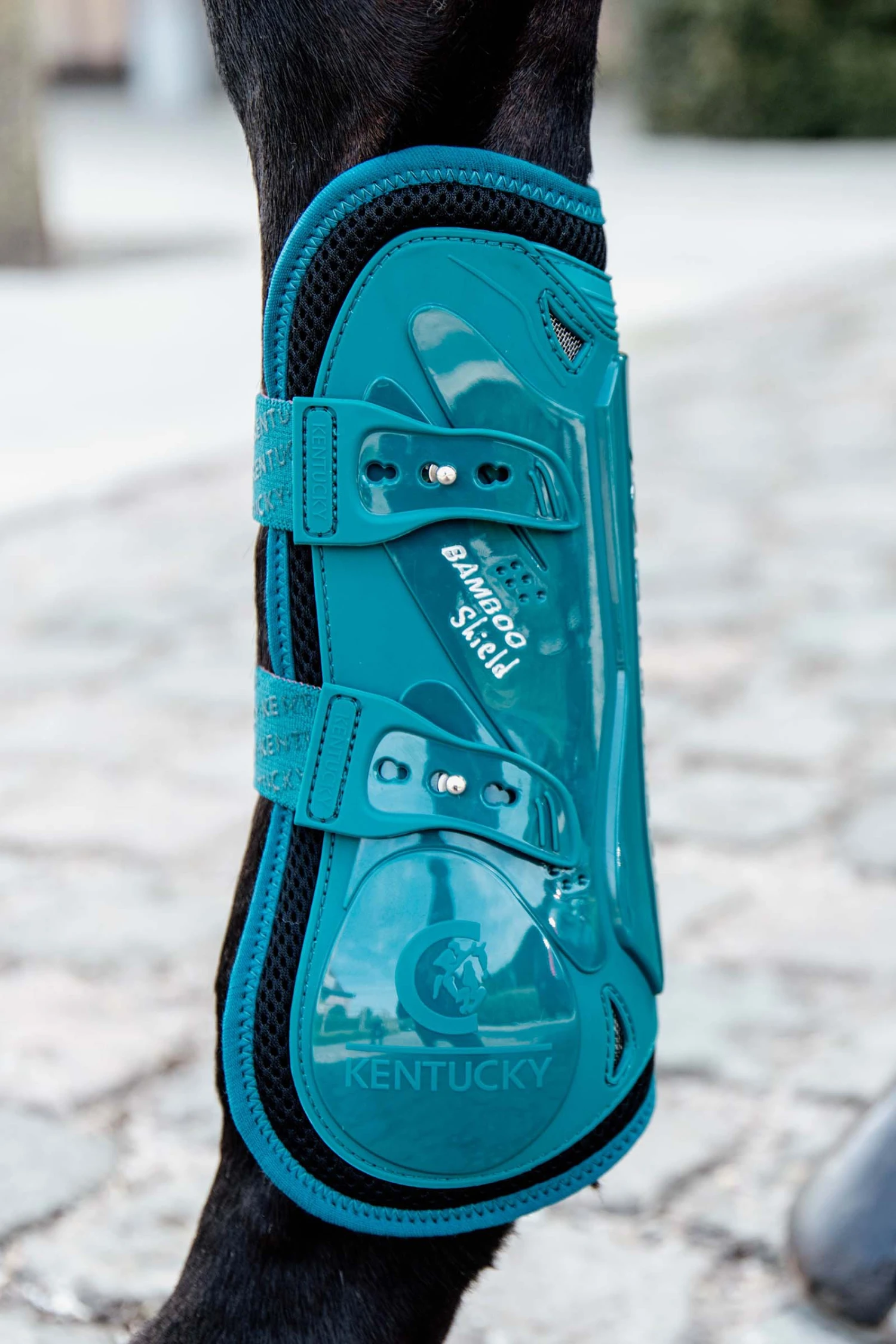 Unsere Bamboo Shield-Vordergamaschen sind mit dem hoch atmungsaktiven und bekannten 3D-Spacer-Futter hergestellt, das ebenfalls in Kentucky 3D-Spacer Weidengamaschen und Pferdedecken verwendet wird. Sie verfügen über eine robuste Außenhülle aus leichter und dennoch starker TPU-Schale, mit einem zusätzlichen BambusSchildeinsatz im Sehnenbereich für optimalen Schutz vor jeglichen Stößen und dem Eindringen spitzer Gegenstände und ist zudem antibakteriell.