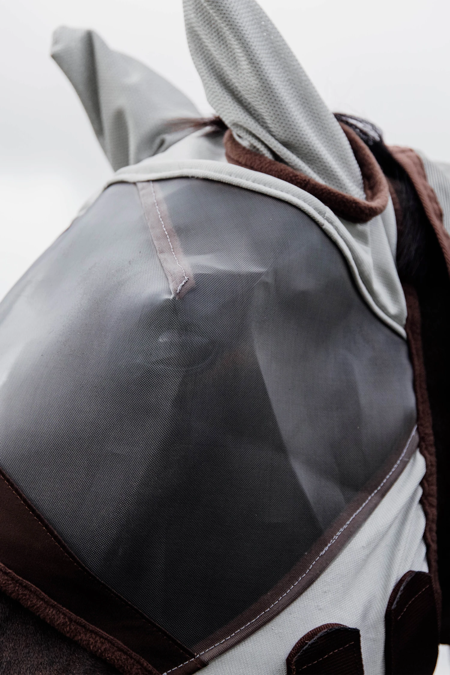 Die Fliegenmaske ist sehr atmungsaktiv, langlebig und garantiert 100% UV-Schutz. Die Nasenklappe der Maske ist abnehmbar, sodass Sie die Schutzstufe bestimmen können. Die Ohren des Fliegenschutzes sind aus einem starken, sehr effektiven gestrickten Anti-Fliegen-Gewebe. Dieses bietet ein schönes Gefühl an den Pferdeohren, da es sehr atmungsaktiv und leicht ist.