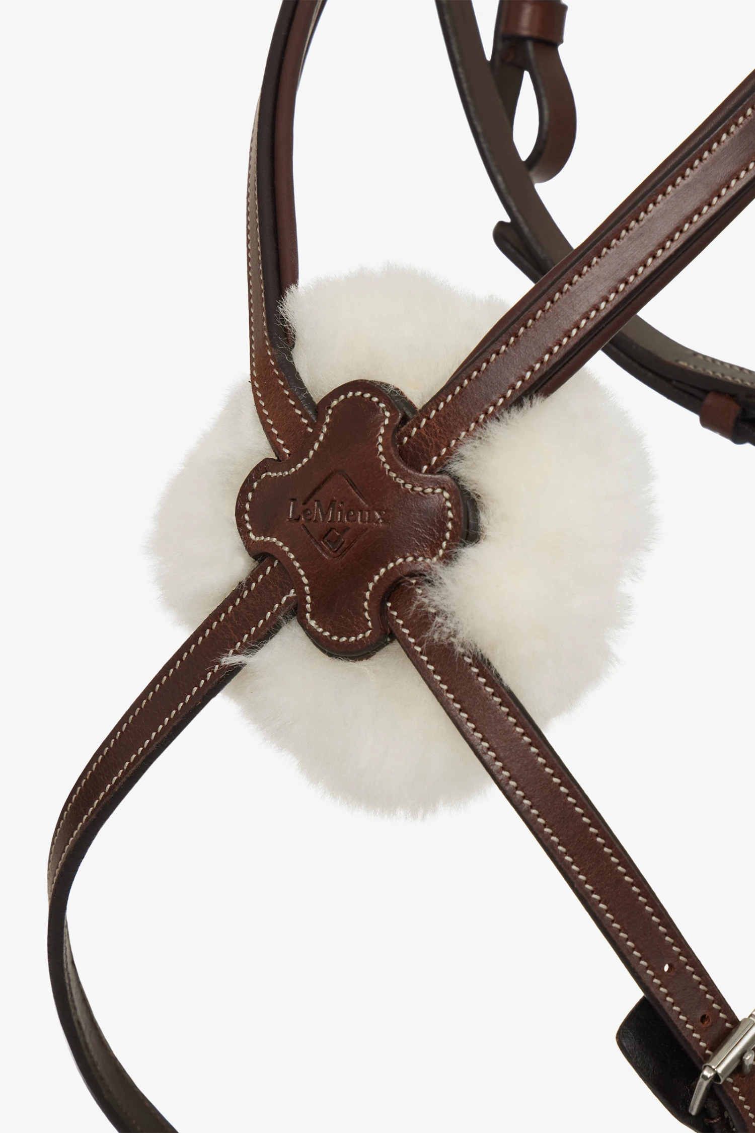 Sie verfügt über einen leicht unterlegten anatomischen Stirnriemen, ein anatomisch geformtes gepolstertes Genickstück und ein abnehmbares Wollpolster am Nasenstück, das unangenehmen Druck verhindert.