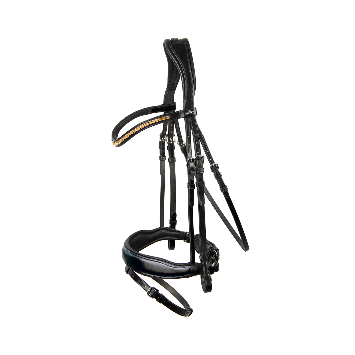 Diese Trense vereint alle Vorteile der Anatomic Line – Select& Mix. Das weich unterlegte anatomisch geformte Spezialreithalfter der Stanton Select Trense sorgen für höchsten Tragekomfort. Das Genickstück ist ebenfalls anatomisch geformt und schmal um empfindliche Nervenbahnen im Genick zu entlasten. Zusätzlich wird der Druck durch die weiche Polsterung reduziert. Zu der Stanton Select gehört ein geschwungenes Kristall-Stirnband. Und das beste? Alle Teile der Trense sind auch einzeln erhältlich, so lassen sich Einzelteile leicht ersetzen.