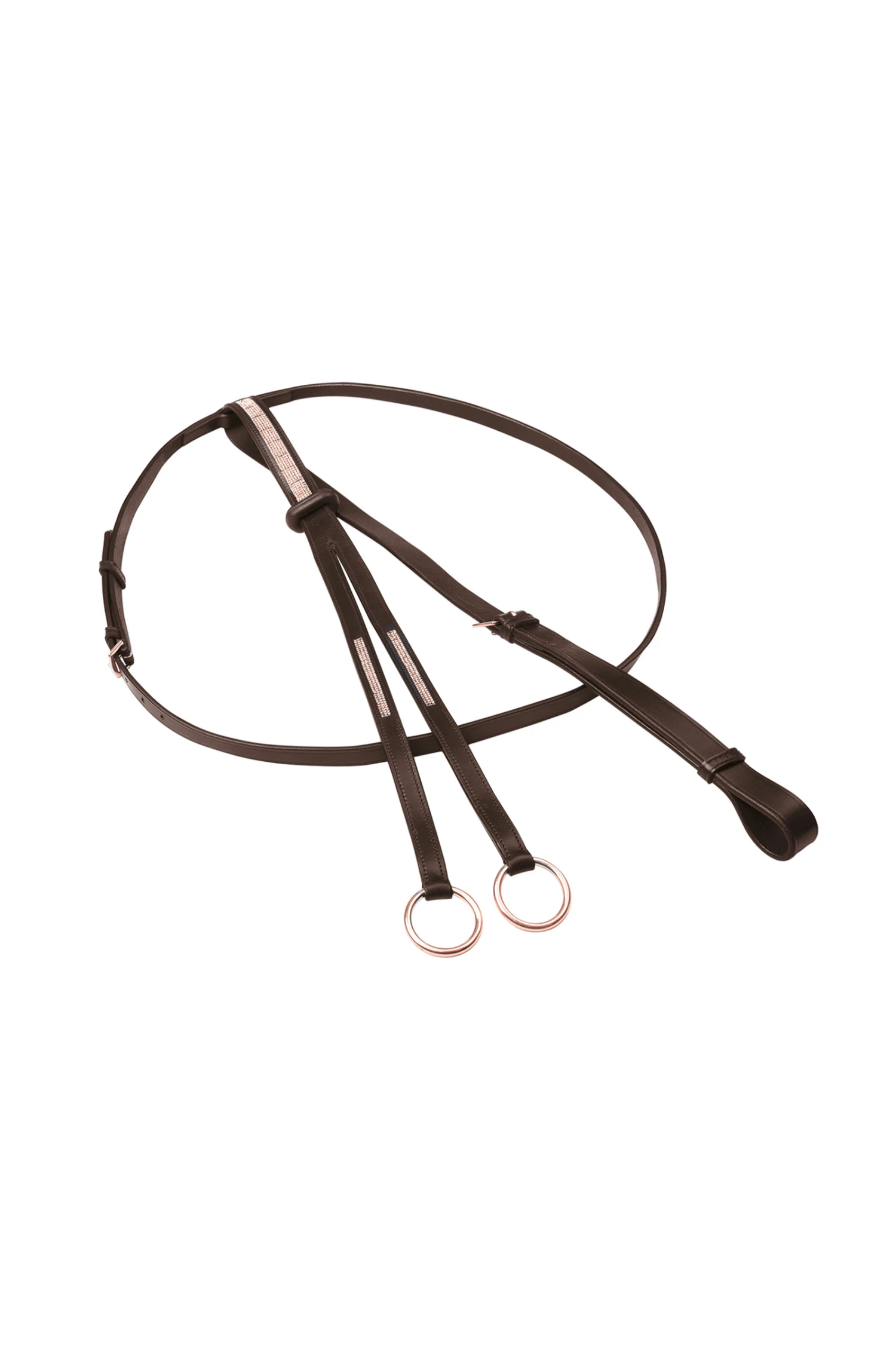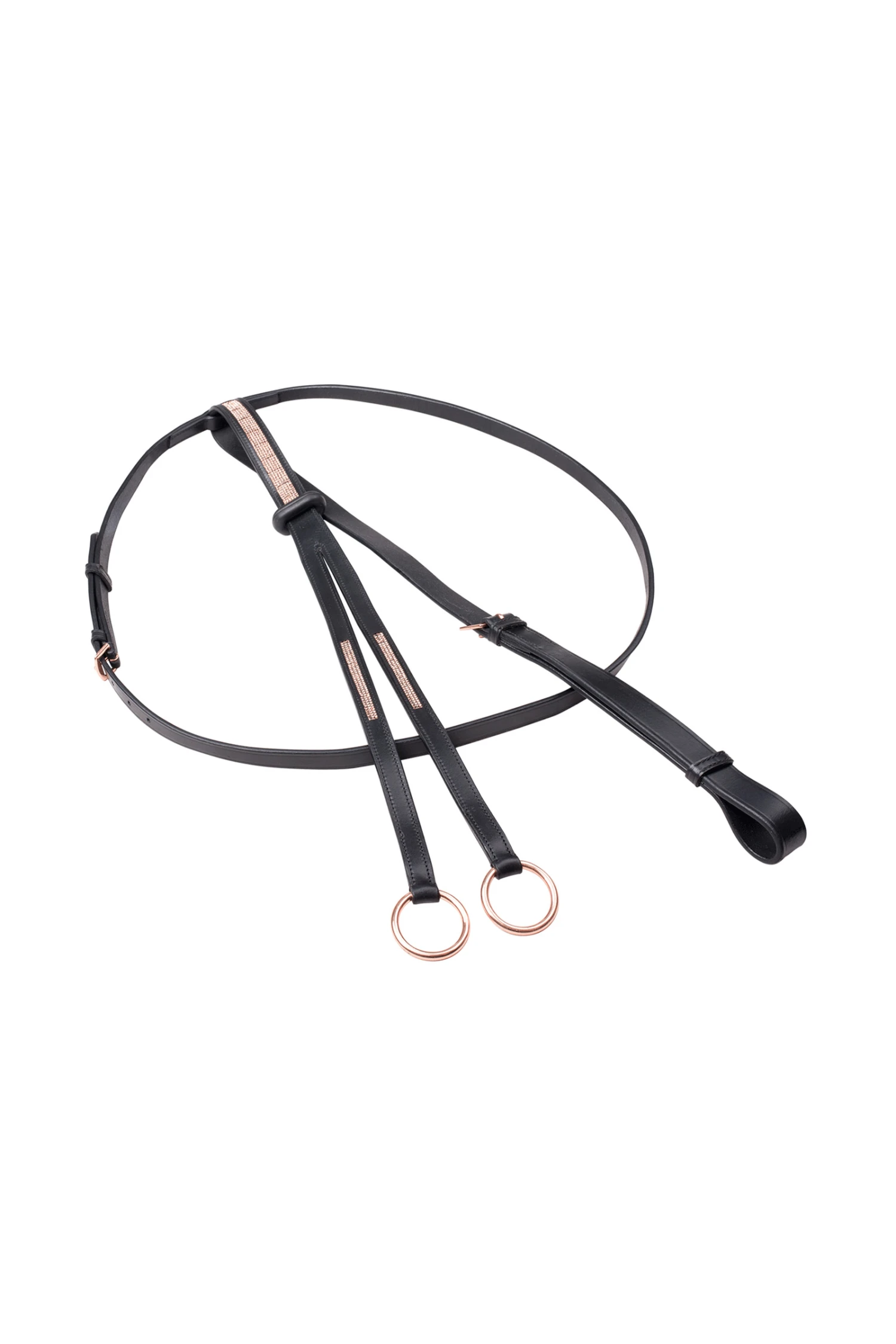 Martingal in bester Lederqualität, hochwertig verarbeitet. Mit edler Strasskette in der Gabel und im Brustteil. Edelstahlschnallen in rosé finish.