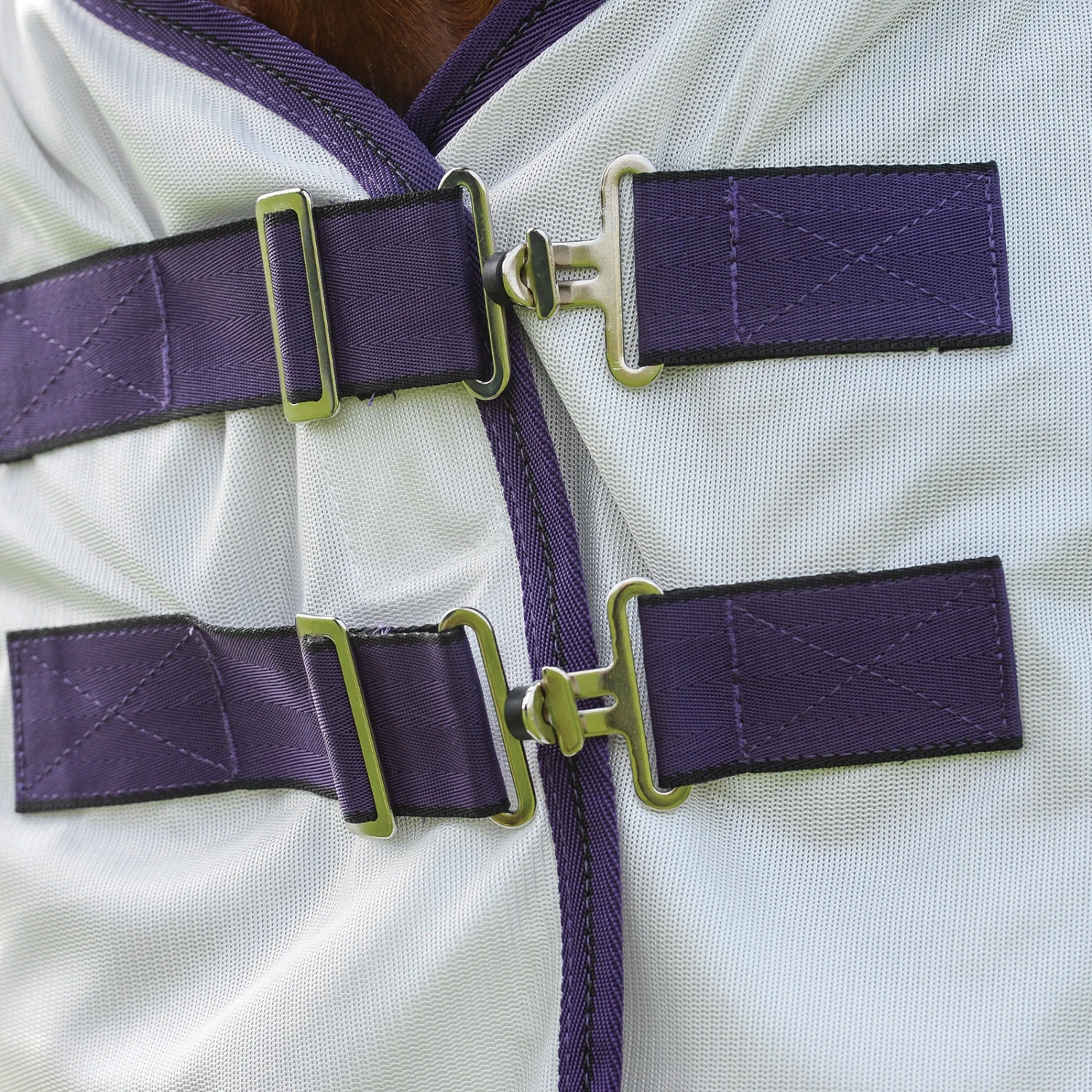 Fliegenschutz aus weichem Mesh mit 210D Nylon Auskleidung an den Schultern, der Mähne und dem Schweif, mit neuem, doppeltem Frontverschluss, traditionellen, seitlichen Gehfalten für Bewegungsfreiheit, niedrig angesetzter Kreuzbegurtung, großem Schweiflatz und verstellbaren, abnehmbaren Beinschnüren.